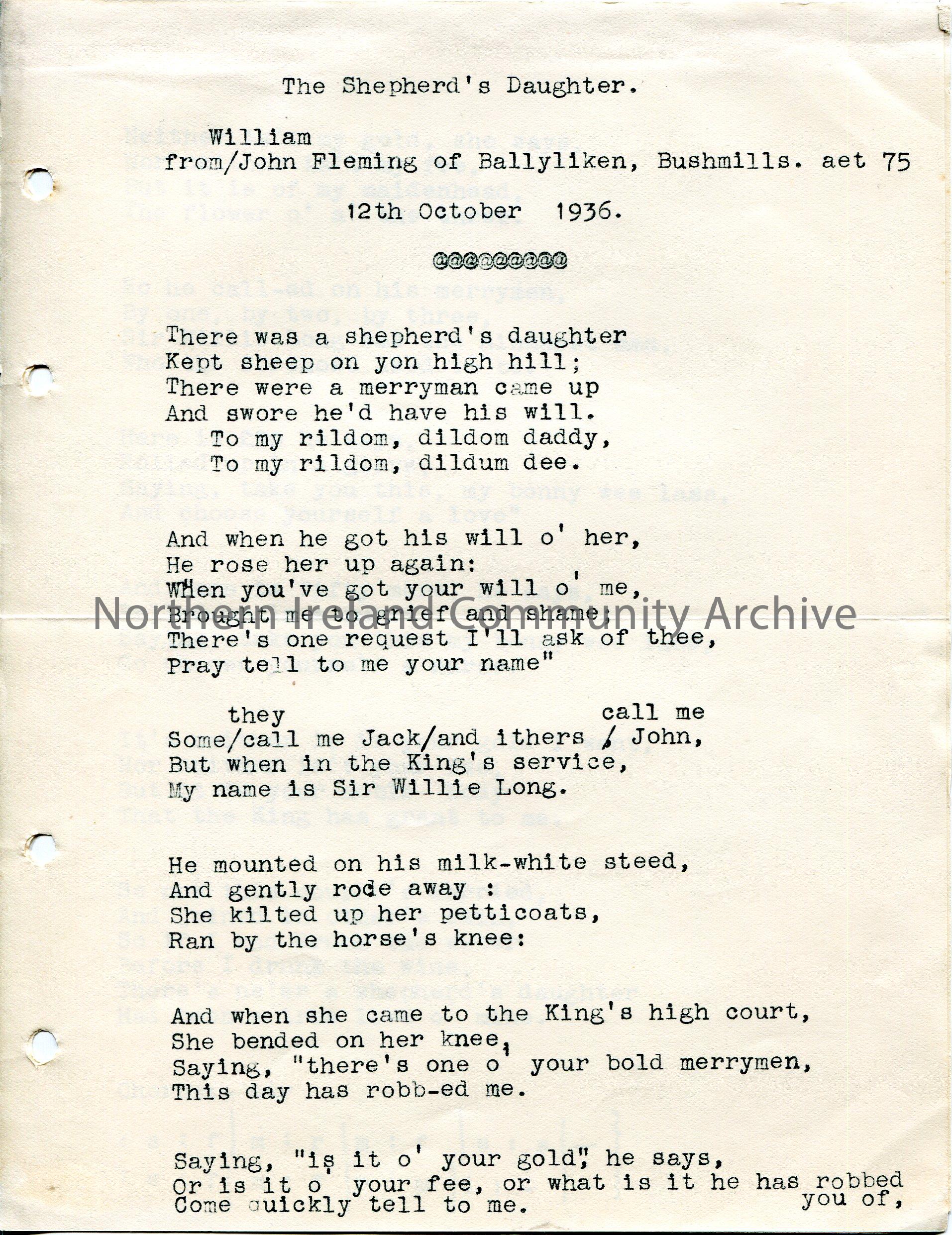 Two pages pasted together of typed words to song and tonic sol-fa notation titled, 'The Shepherd's Daughter'. From William John Fleming of Ballyliken, Bushmills, 12th October 1936.