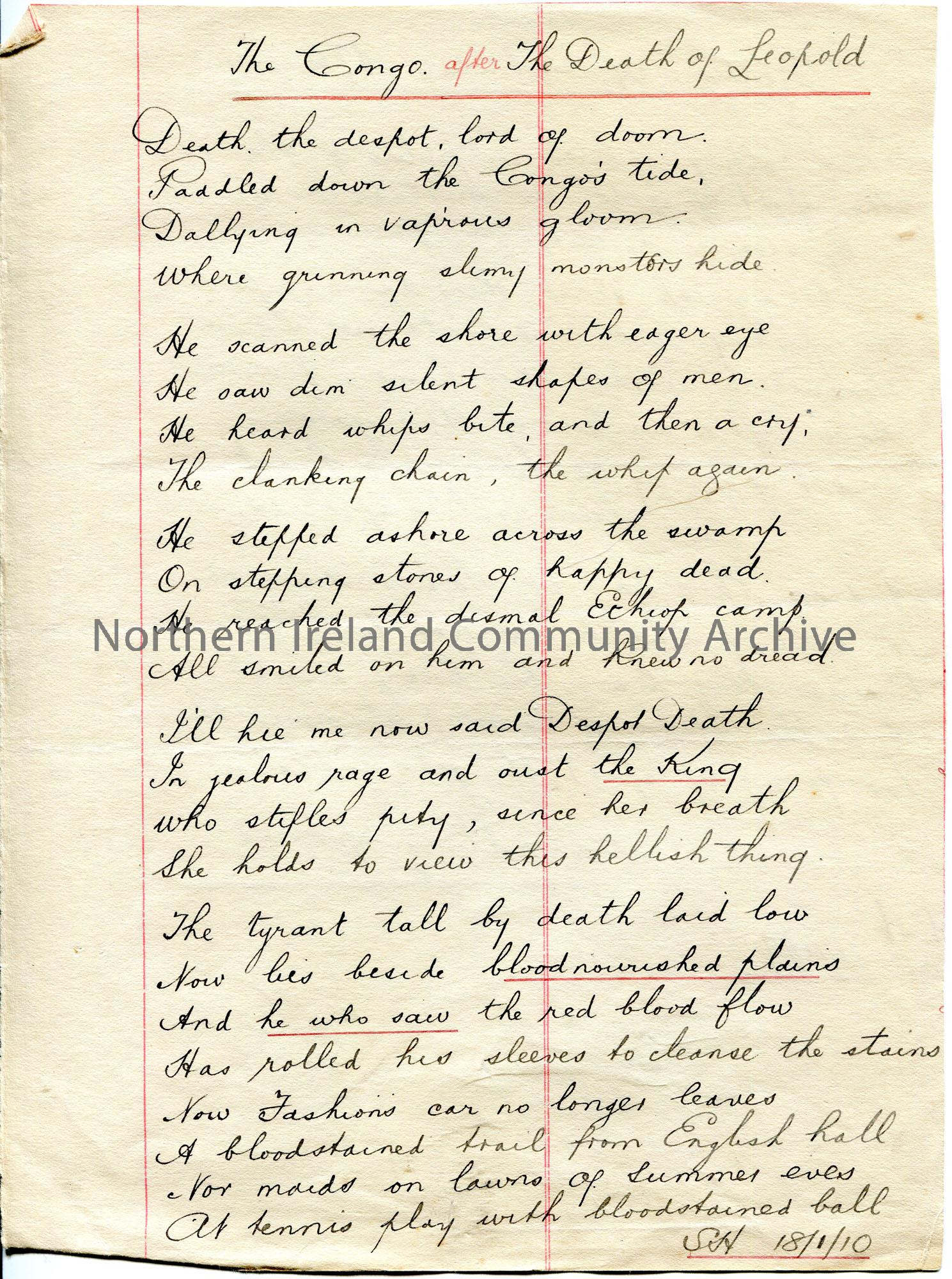 Two poems handwritten by Sam Henry on each side of page. One poem is titled, ‘The Congo after The Death of Leopold’. Initialled, ‘SH. 18/1/10’. The ot…