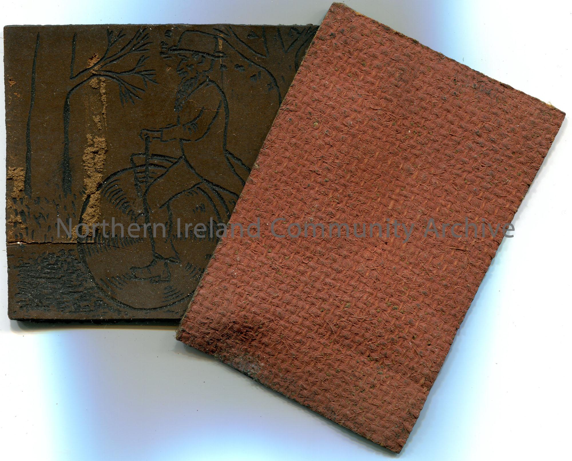 Two rectangle shaped linocuts with red/brown coloured backing, stuck together. One has an image of a man on a bicycle and the other is a pot hanging at a fireplace and a cat and hen sitting in front of the fire.