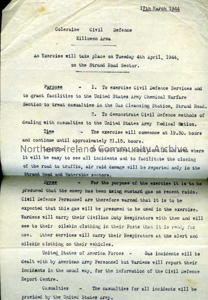 Two sheets of typed paper, titled "Coleraine Civil Defence, Killowen Area - An exercise will take place on Tuesday 4th April, 1944, on the Strand Road Sector." This document is dated 17th March 1944 and handwritten on the blank side is "Casualty Officer Garvagh". The purpose is to exercise Civil Defence Services and to grant facilities to the United States Army Chemical Warfare section to treat casualties in the Gas Cleansing Station, Strand Road and to demonstrate Civil Defence methods of dealing with casualties to the United States Army Medical Section.