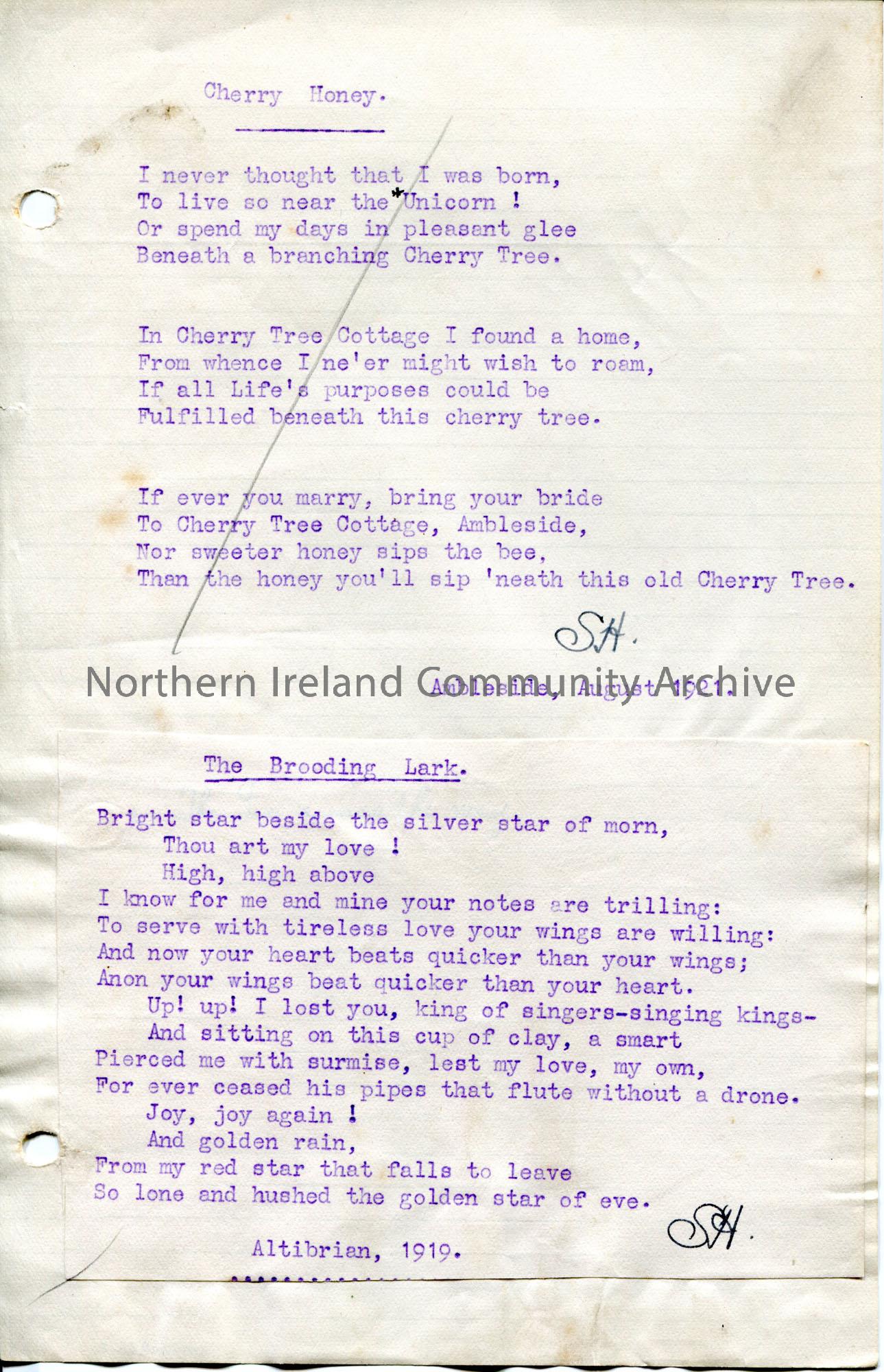 Two typed poems by Sam Henry. One is titled, 'Cherry Honey' and is scored out. Initialled SH, Ambleside, August, 1921. Re a Cherry Tree. The second poem is titled, 'The Brooding Lark' and is initialled 'SH. Altibrian, 1919'. Re birds.