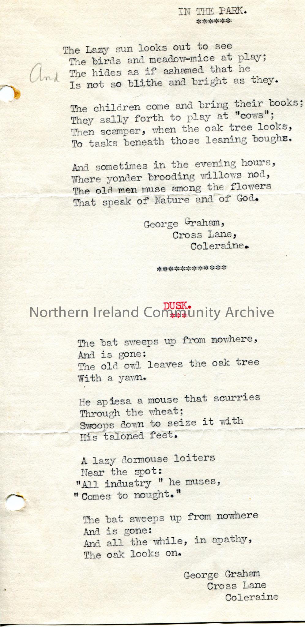 Two typed poems or words to songs on one page. Both are from George Graham, Cross Lane, Coleraine. One is titled, 'In the Park' and is 3 verses. The other is titled 'Dusk' and is 4 verses.