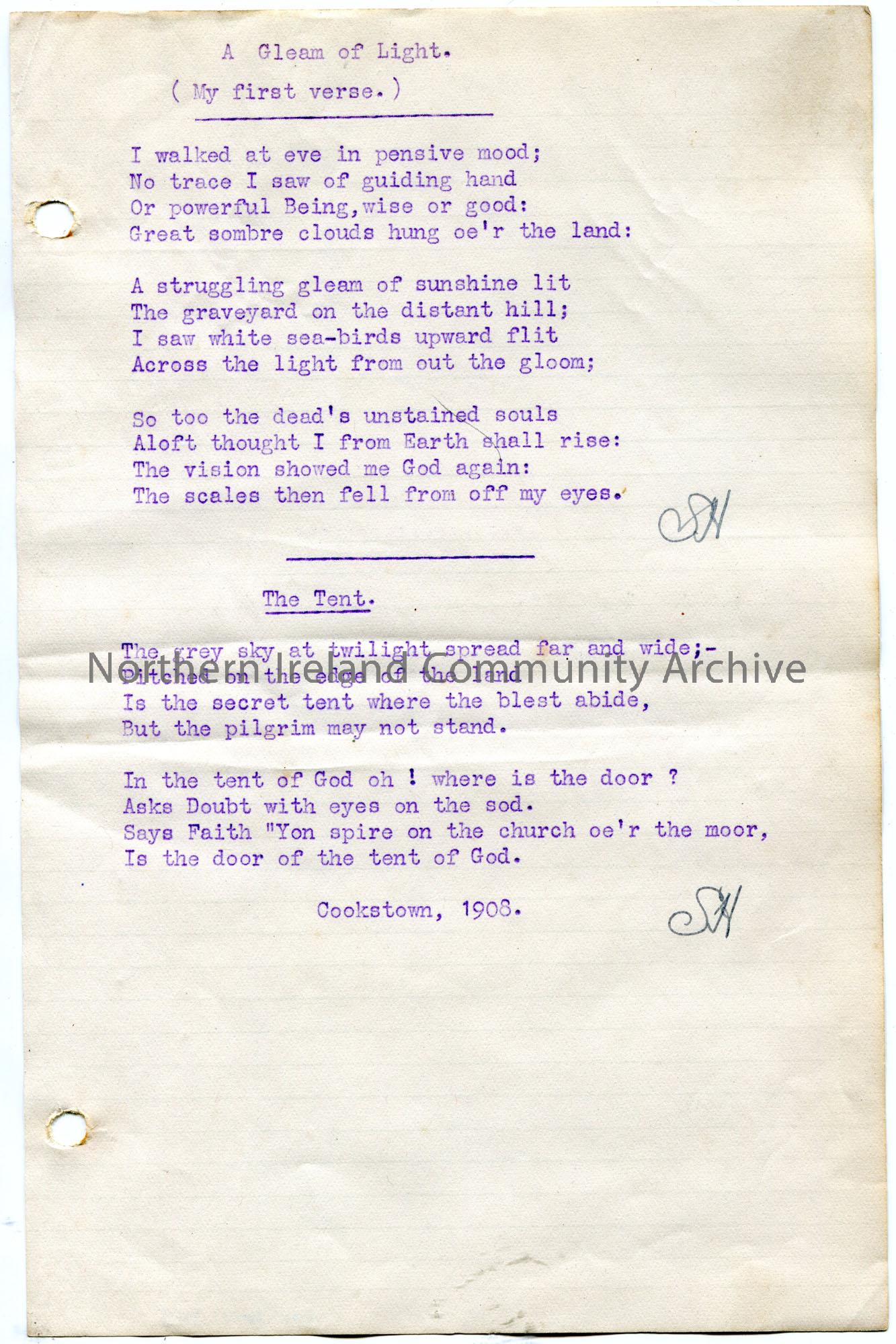 Two typed poems titled, ‘A Gleam of Light (My first verse)’ and ‘The Tent’. Both by Sam Henry. ‘The Tent’ has a note of ‘Cookstown, 1908’ typed below …