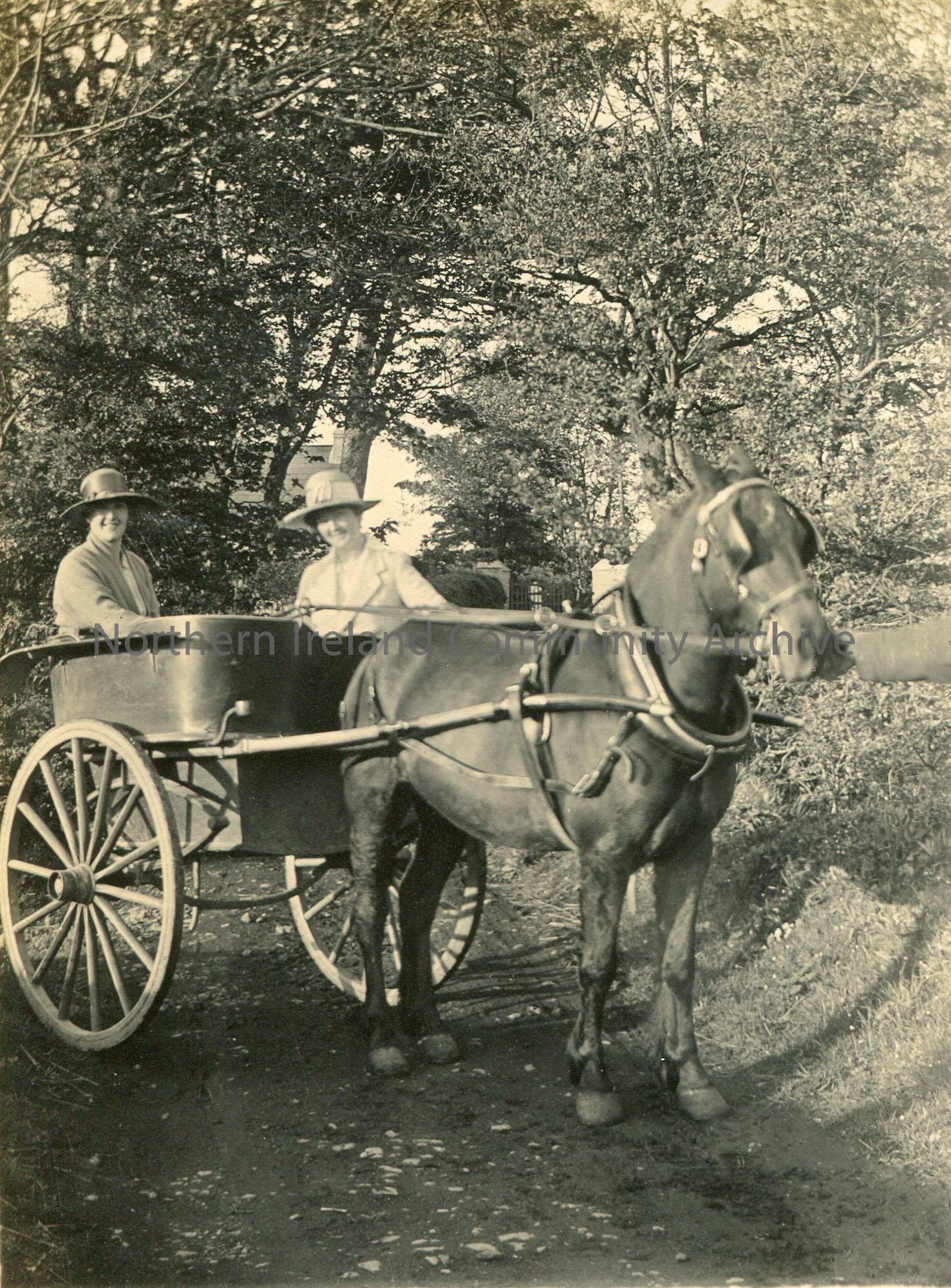 Two women sitting in a horse and cart. Handwriting on reverse, ‘Coleraine area’.
