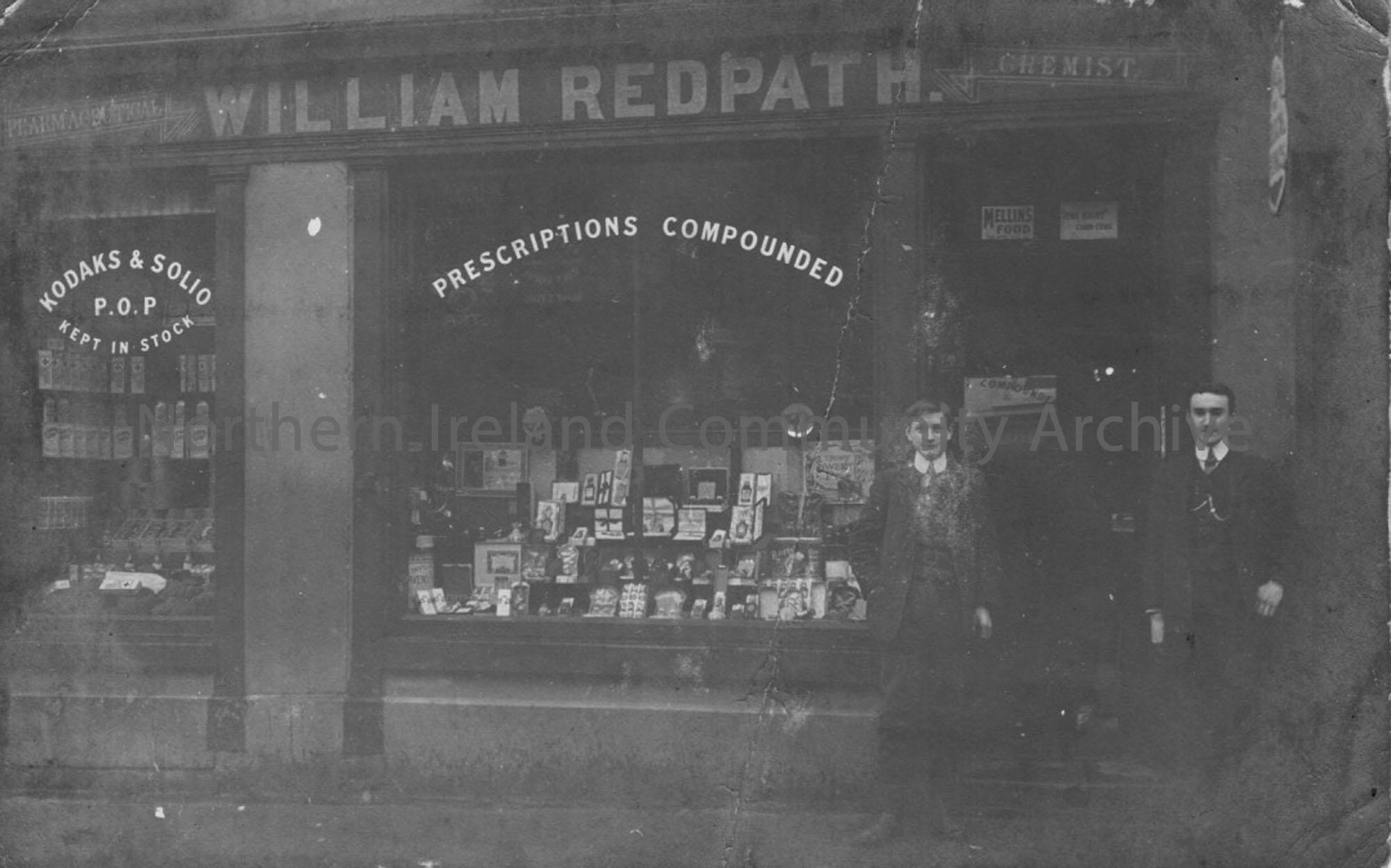 Two young men stand outside William Redpath’s Chemist store on Church street, Ballymoney