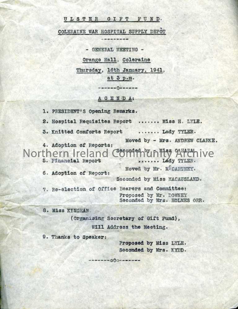 Typed Agenda titled 'Ulster Gift Fund. Coleraine War Hospital Supply Depot - General Meeting'. The meeting was held in the Orange Hall, Coleraine on 16th January 1941.