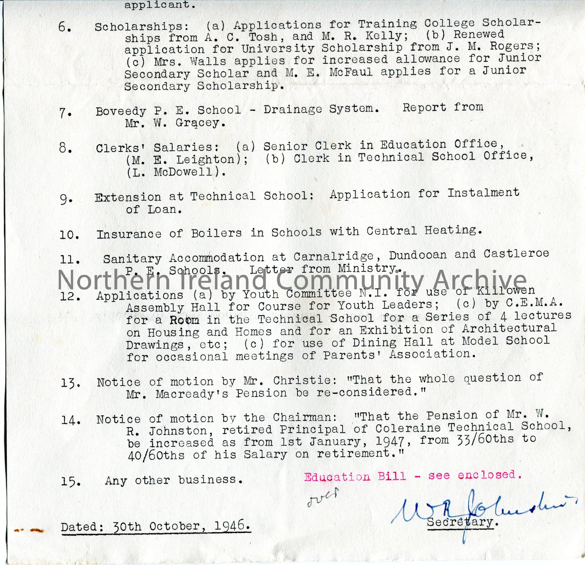 Typed agenda to Sam Henry from the Secretary of Coleraine Regional Education Committee, W R Johnston. For meeting taking place in Coleraine Town Hall on 2nd November 1946. 15 points on agenda. Education Bill enclosed. Handwritten list of attendees on reverse by Sam.