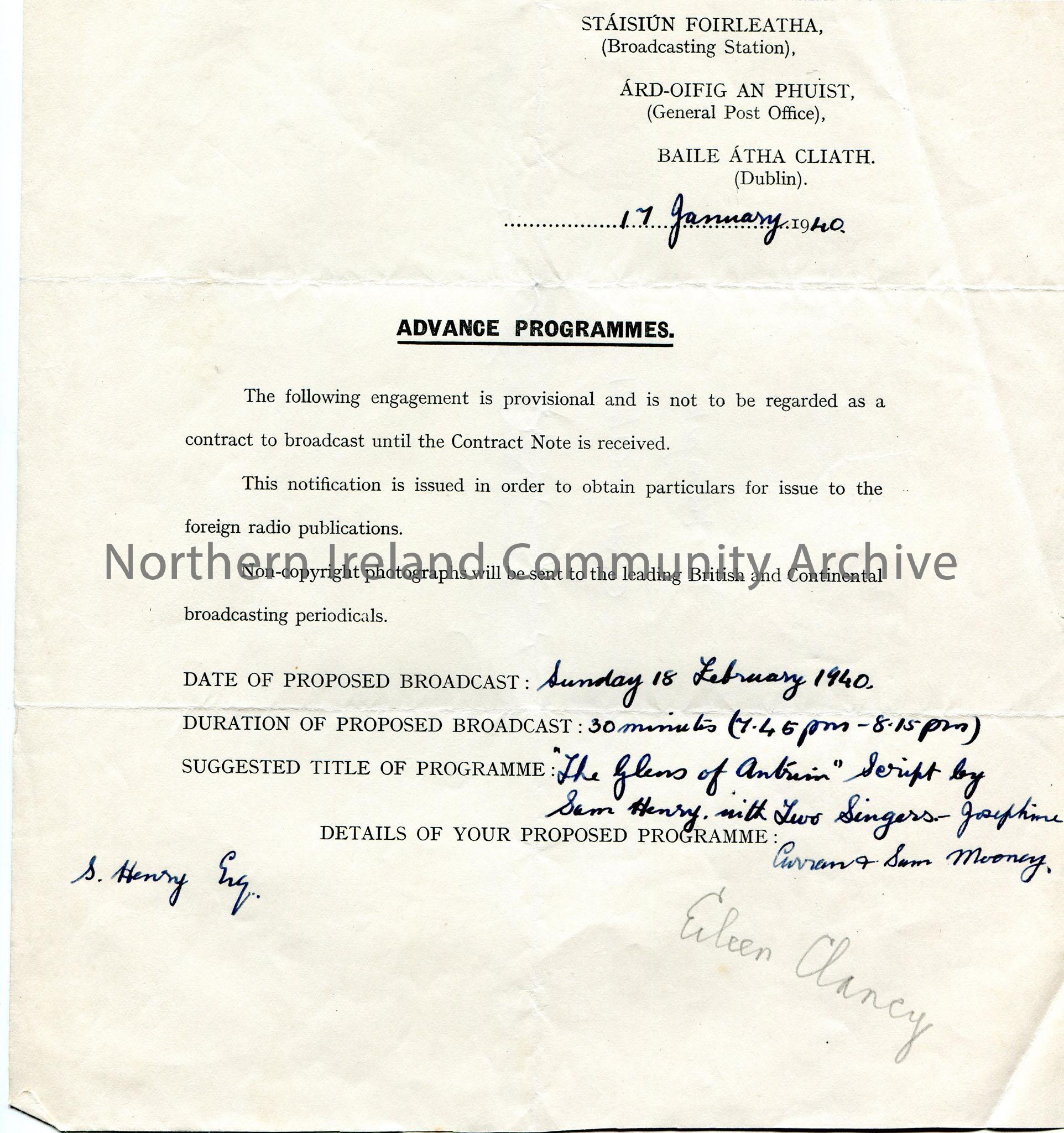 Typed and handwritten document dated 17th January, 1940. Titled 'Advanced Programmes'. Proposal for a broadcast for Sunday 18th February, 1940, 30 minutes long, suggested title "The Glens of Antrim" script by Sam Henry with two singers Josephine Curran and Sam Mooney. Eileen Clancy written in pencil at bottom of document. 1870-1880 Galway written in pencil on back of page.