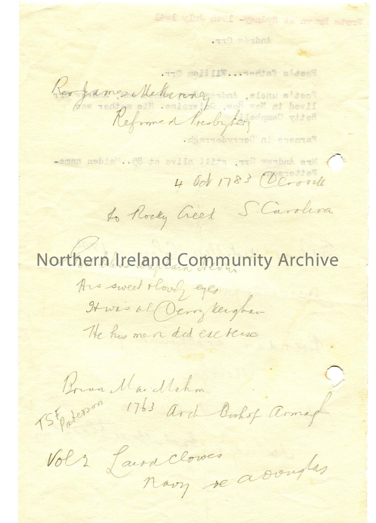 Typed and handwritten notes of genealogical interest re Andrew Orr. – img226