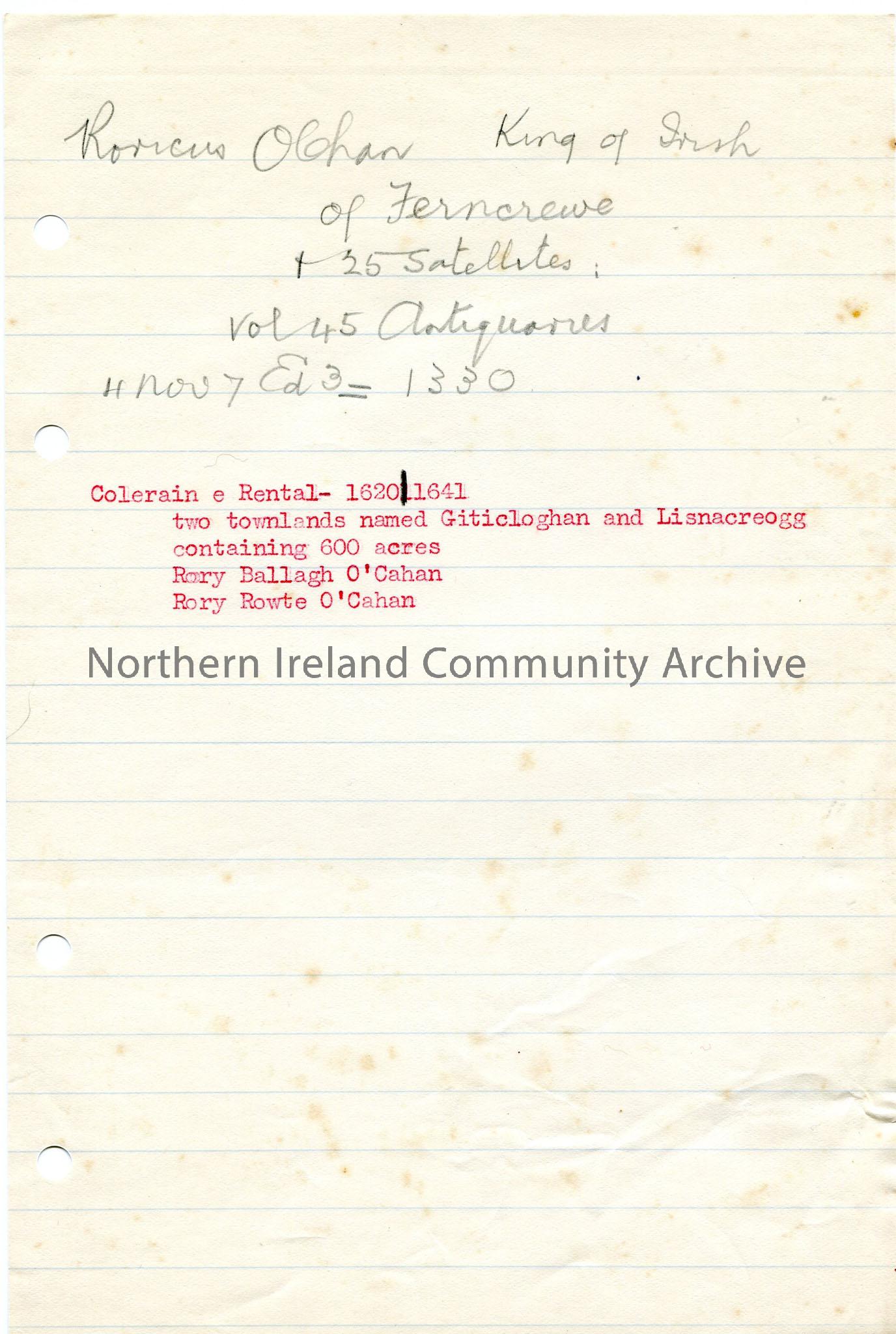 Typed and handwritten notes re O'Cahans and local land.