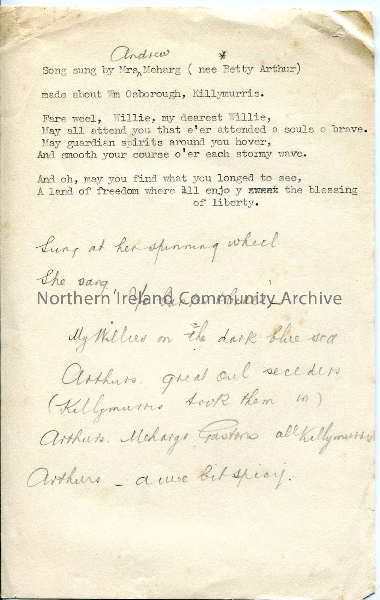 Typed and handwritten notes re song sung by Betty Arthur, wife of Andrew Meharg (and great aunt of Chester Arthur)
