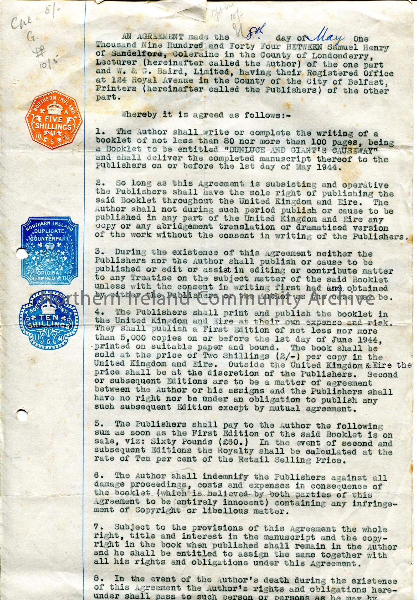 Typed and signed agreement between Sam Henry and W. & G. Baird, Ltd for the publication of Sam's booklet 'Dunluce and Giant's Causeway'. Sam was to be paid £60 when the book went on sale.