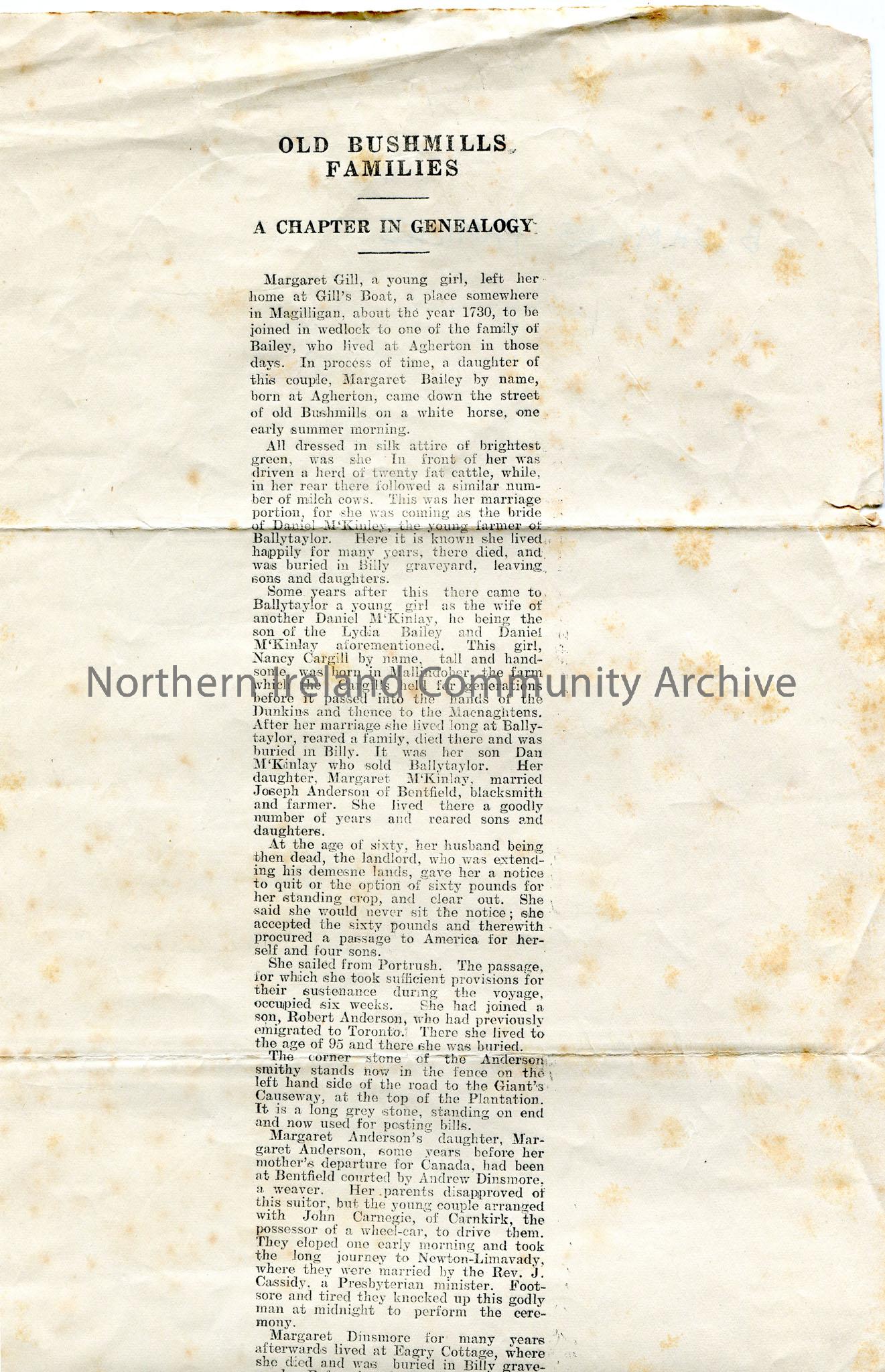 Typed article titled, ‘Old Bushmills Families. A Chapter in Genealogy’. Mentions family names- Gill, Bailey, McKinley, Anderson and Dinsmore.