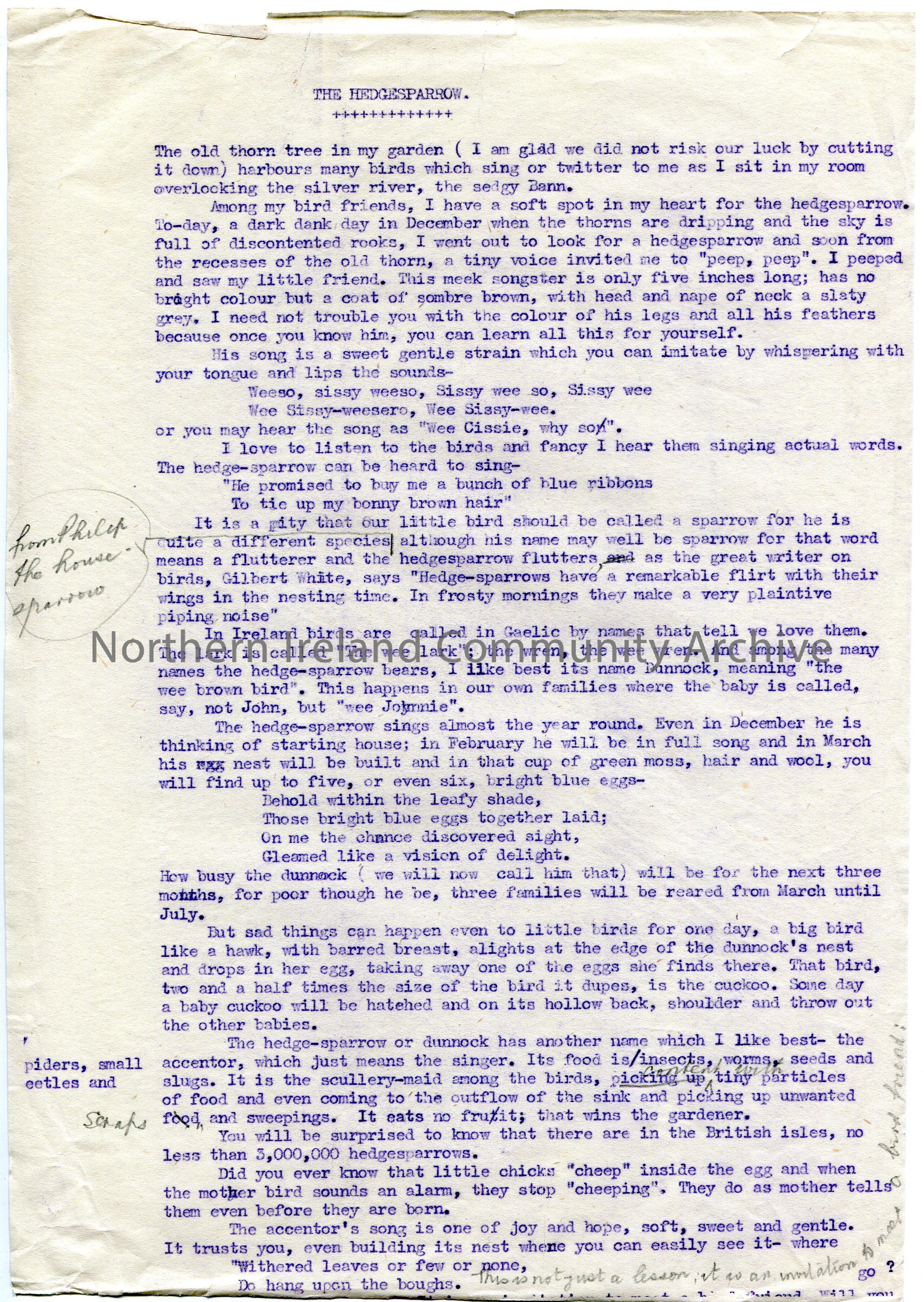 Typed article titled, ‘The Hedgesparrow’. Annotated in pencil.