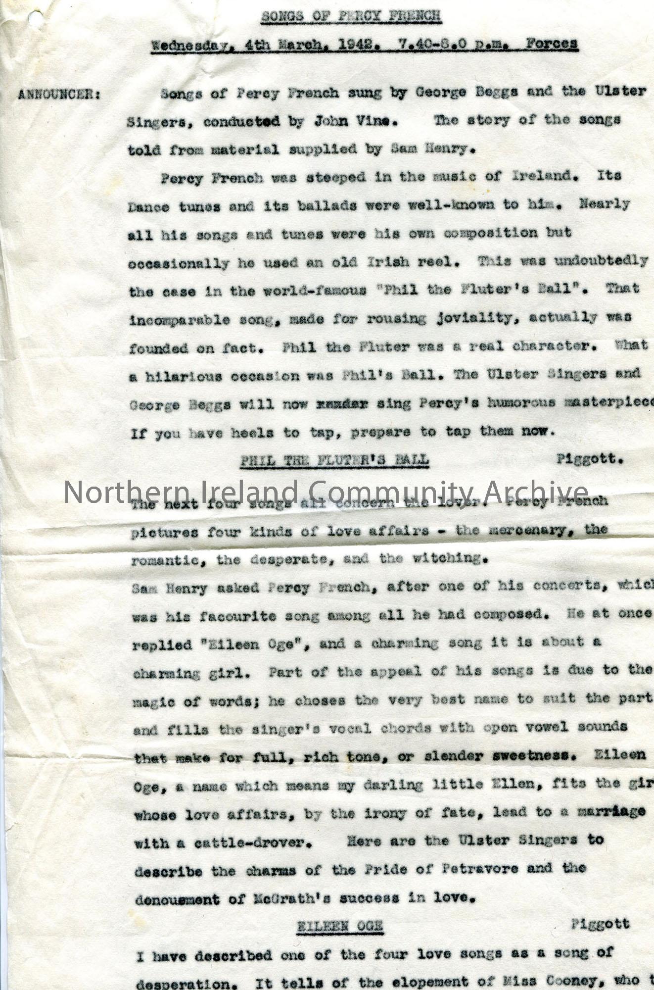 Typed BBC script about Percy French, incorporating material supplied by Sam – ‘Phil the Fluter’