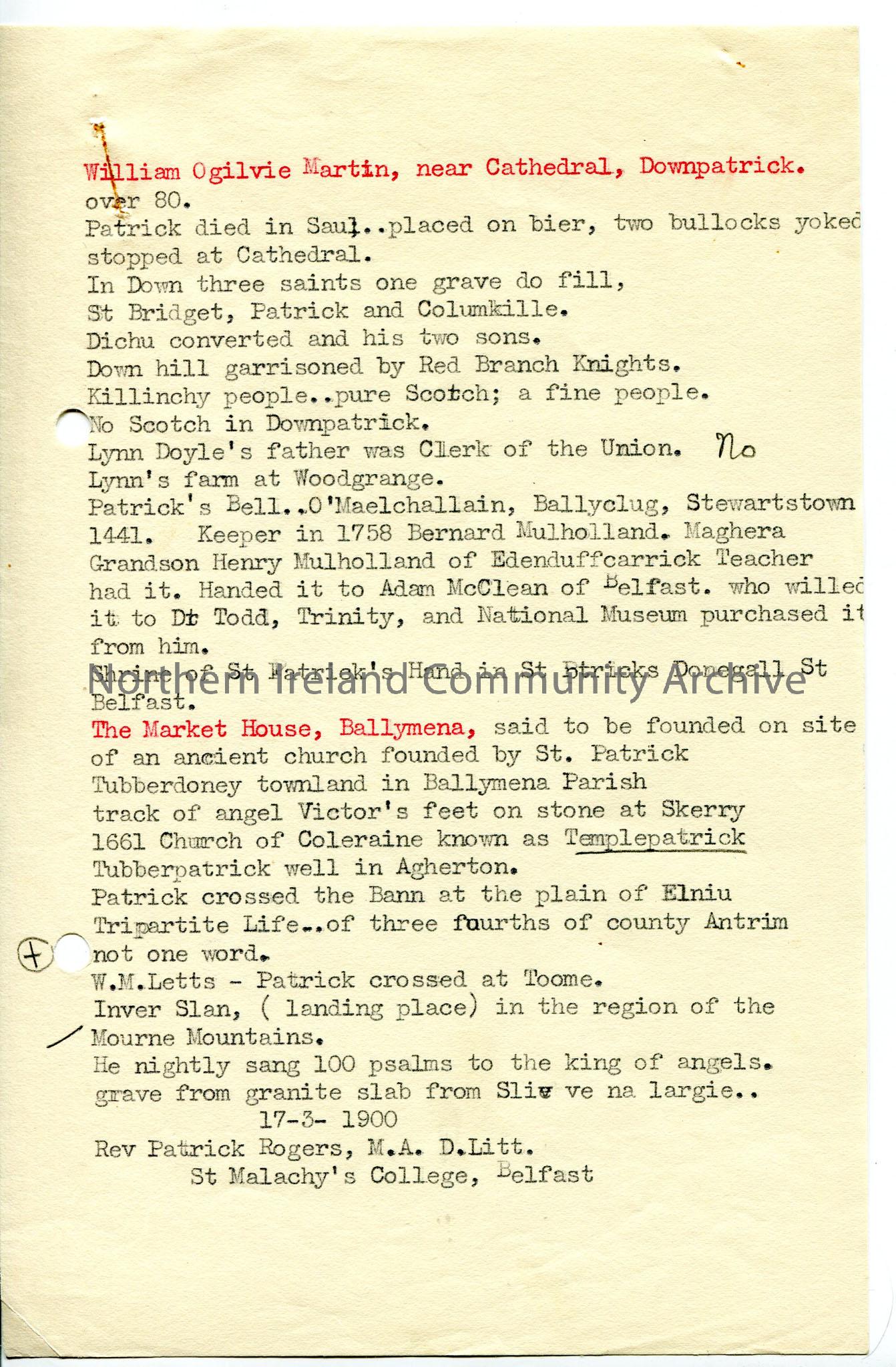Typed brief notes about St Patrick – Downpatrick area (including references to ‘pure Scotch’ in Killinchy but none in Downpatrick), Market House Bally…