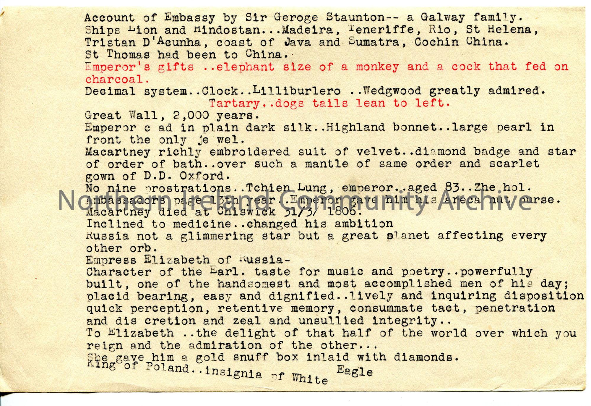 Typed brief notes, appear to relate to Lord McCartney, First Earl, who became ambassador to China and Russia in the 18th century