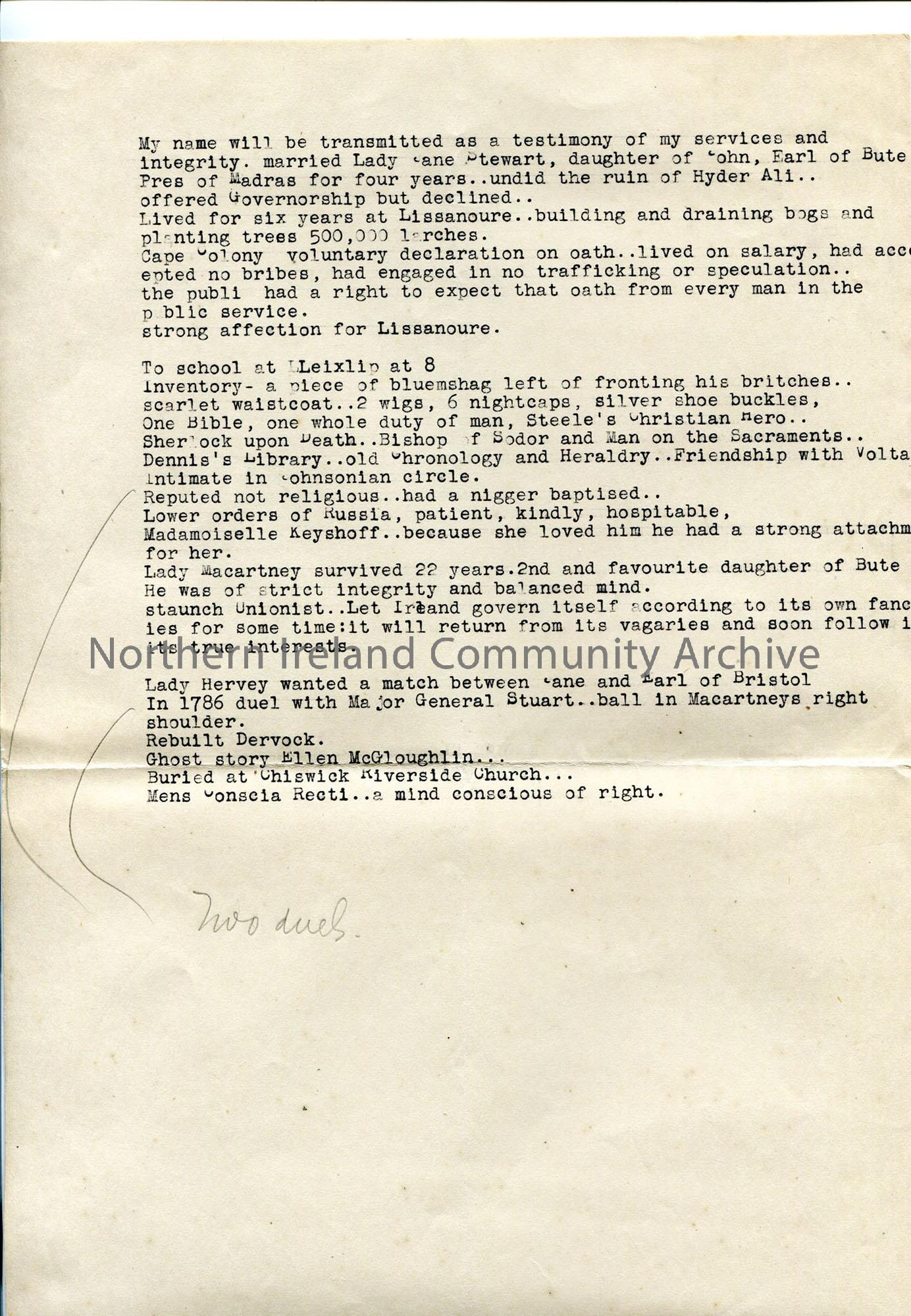 Typed brief notes – appear to relate to Lord McCartney, first Earl