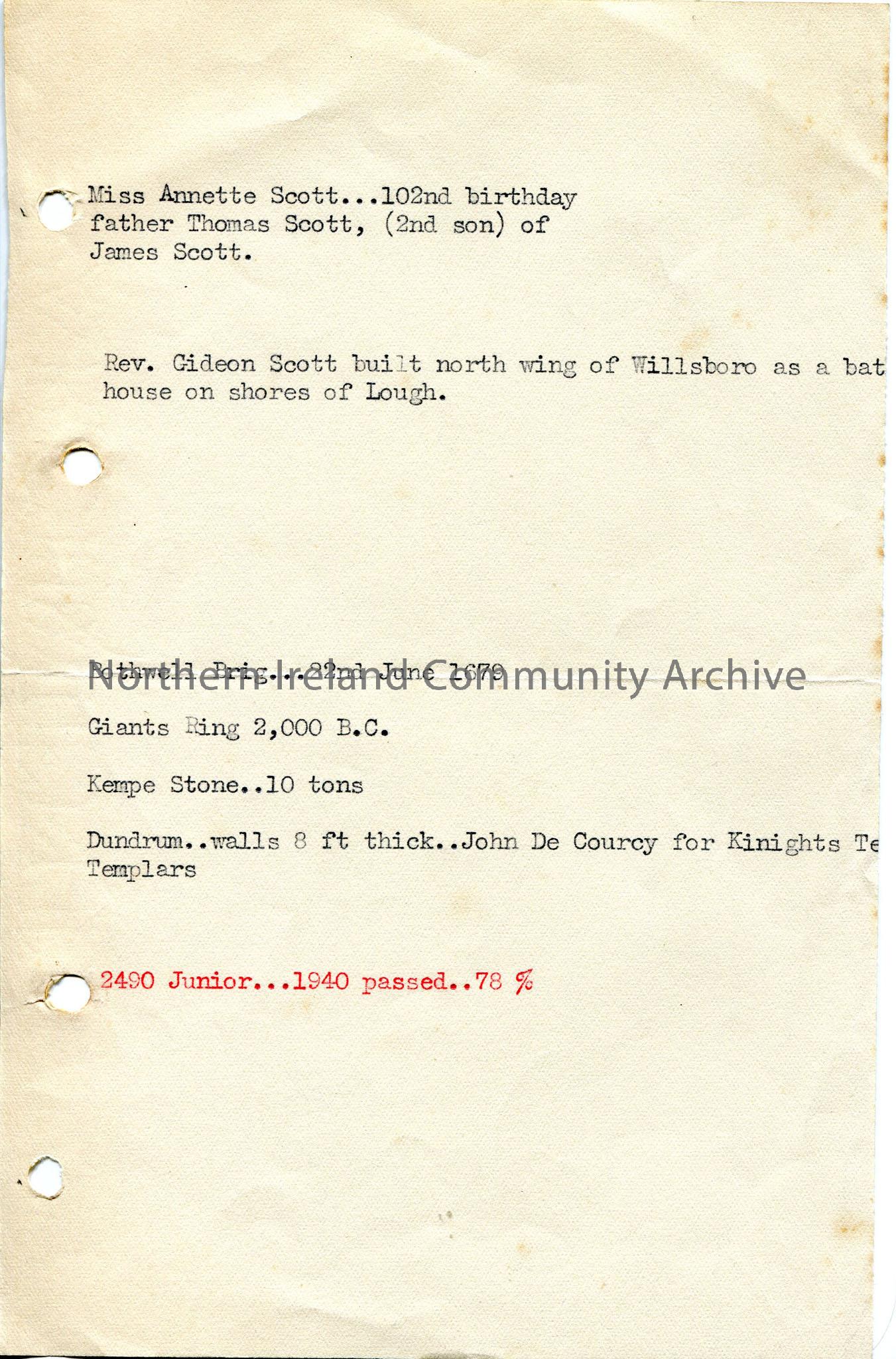 Typed brief notes re Annie Scott and family and dates for old and ancient structures