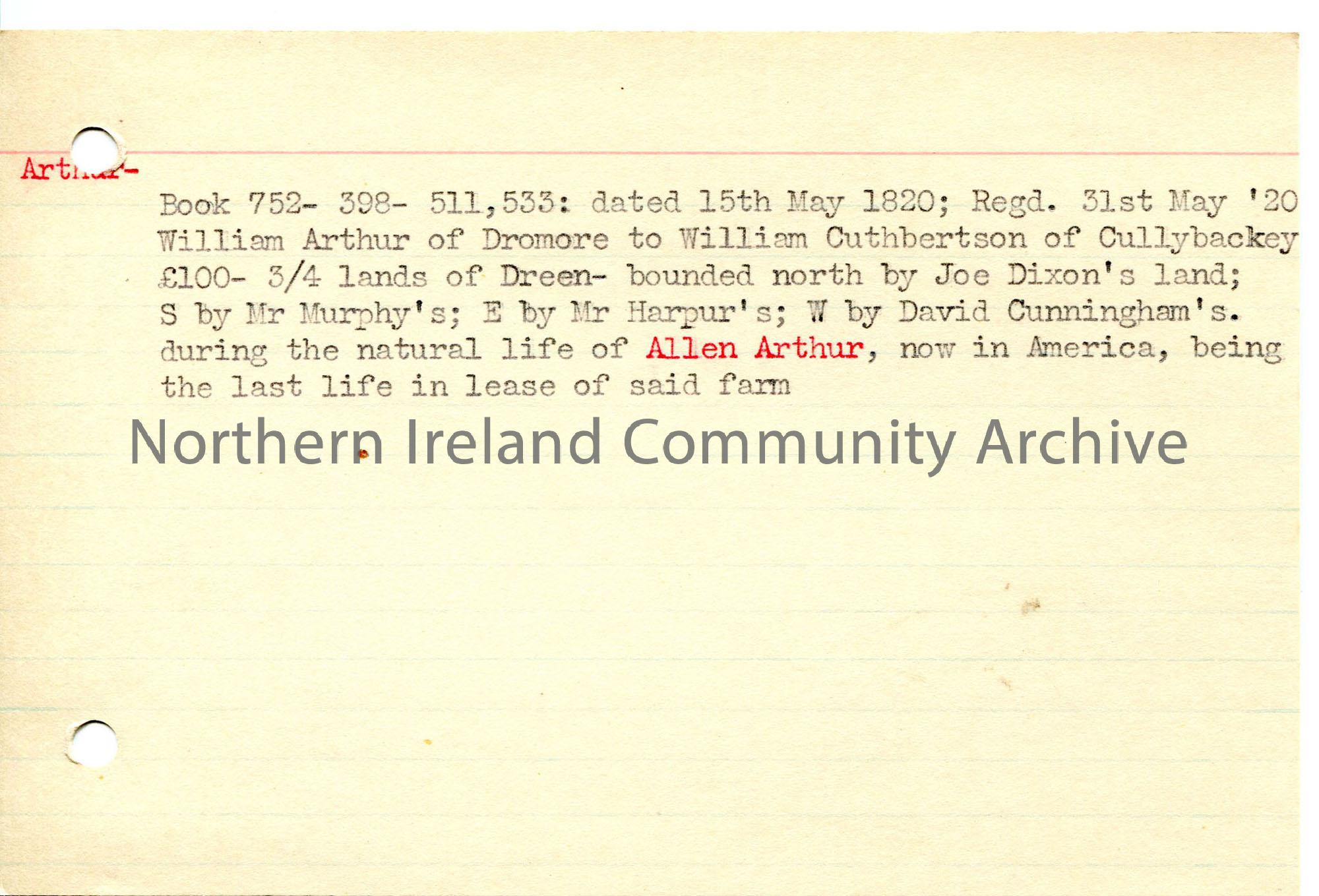 Typed brief notes re Arthurs and Dreen landholdings – surrounding landholders’ names.