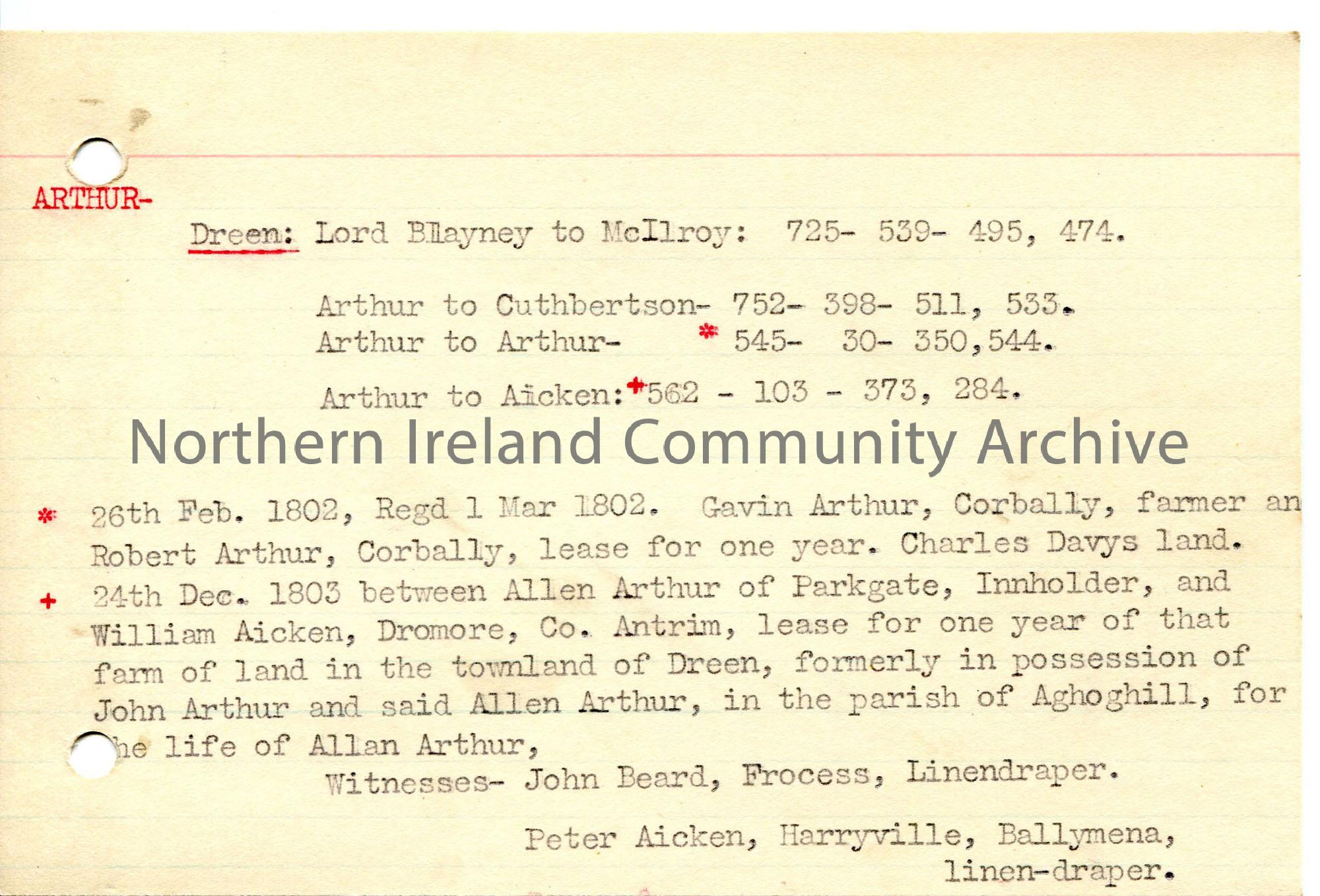 Typed brief notes re Arthurs, Dreen land holdings, leases (witness names and occupation)