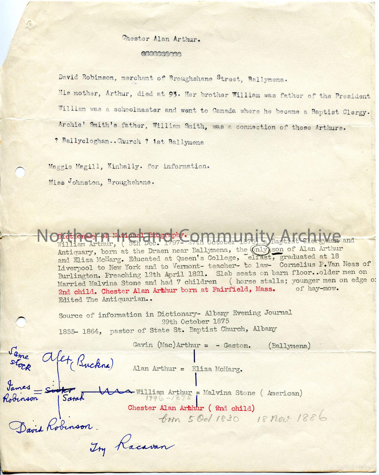 Typed brief notes re Arthurs - including his aunt (nee Arthur) and cousin, Robinsons, merchants from Ballymena - some details from American life and brief family line.