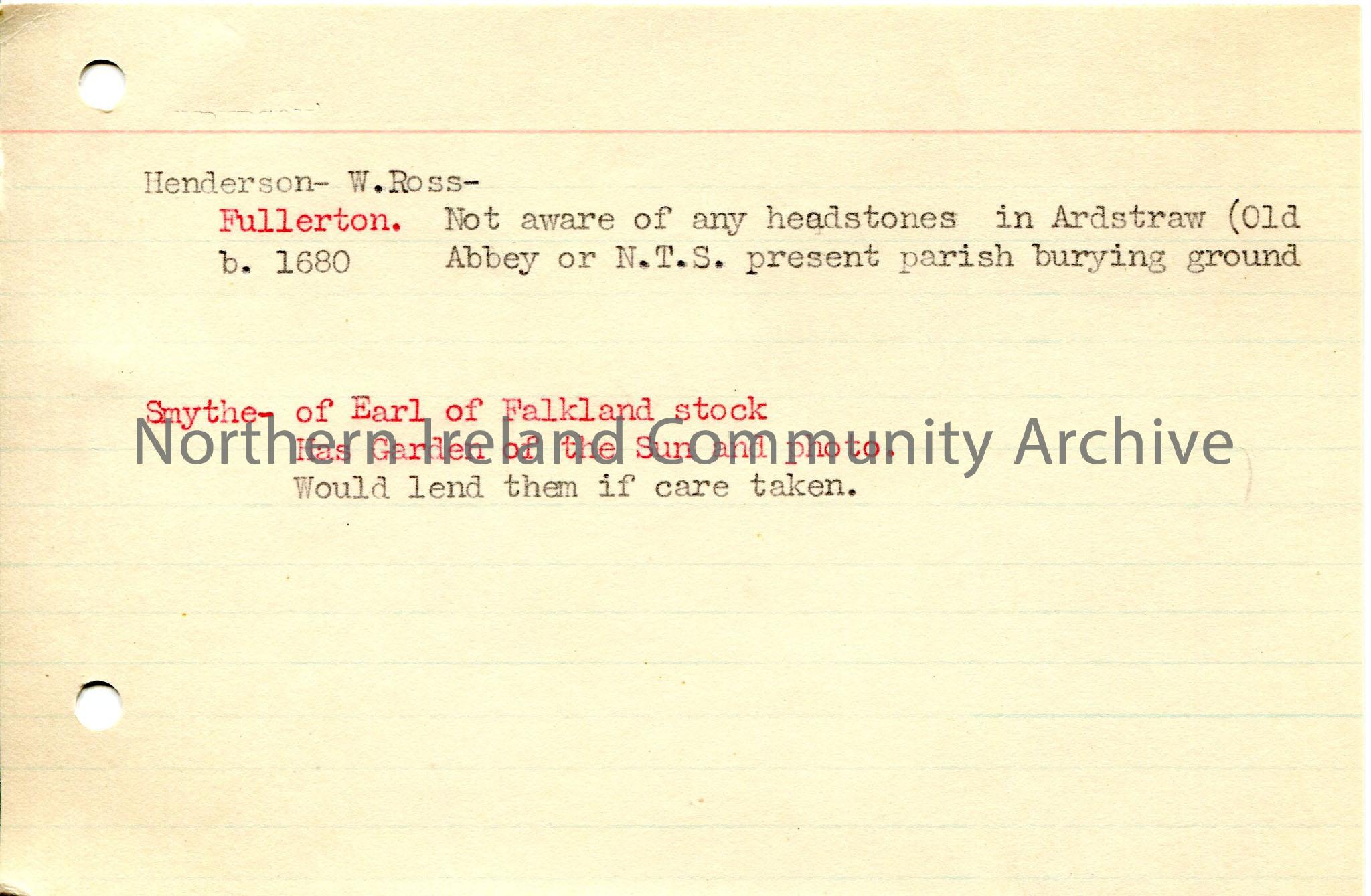Typed brief notes re Fullerton family – no headstone in Ardstraw for Fullerton born 1680