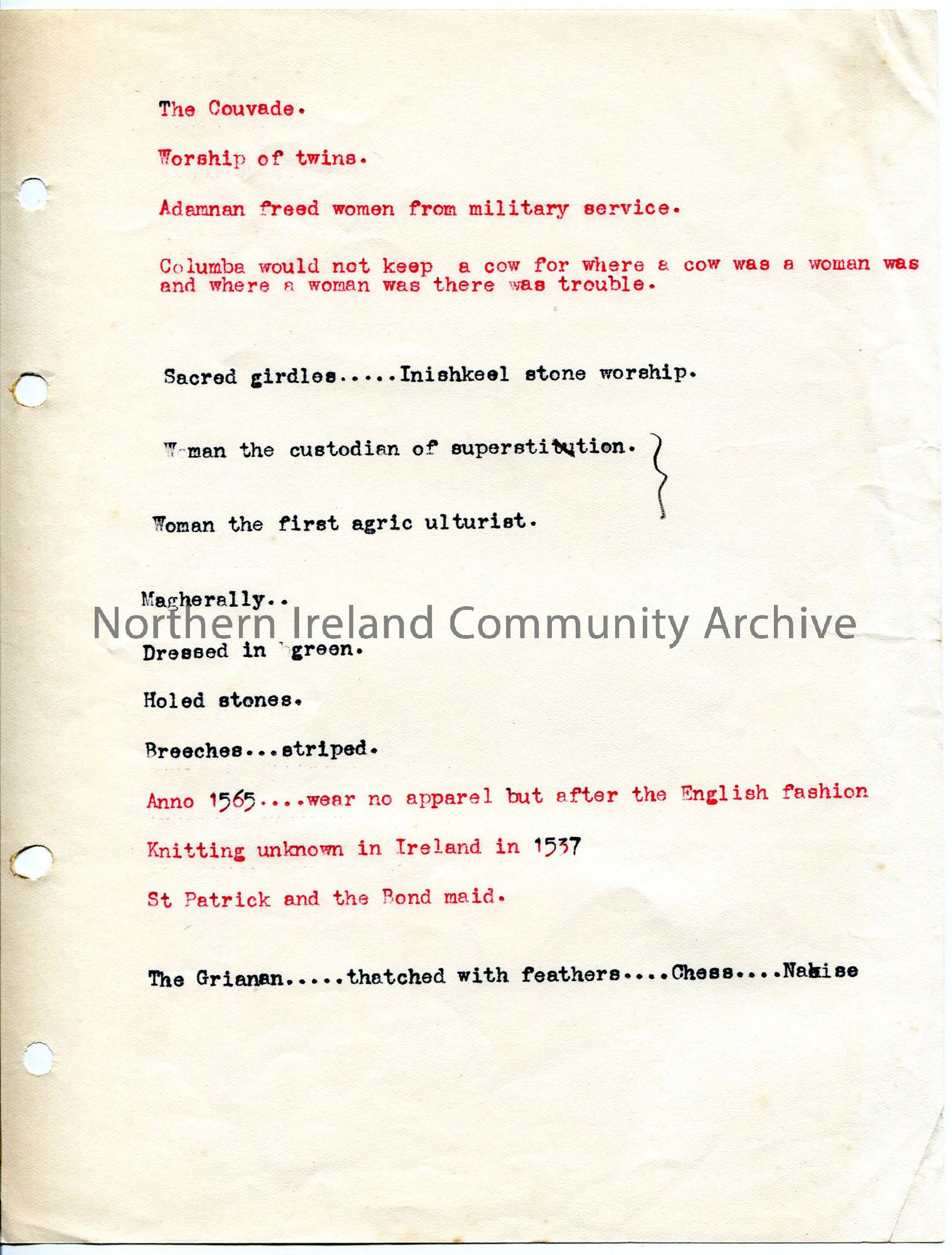 Typed brief notes relating to customs and traditions, mostly relating to women