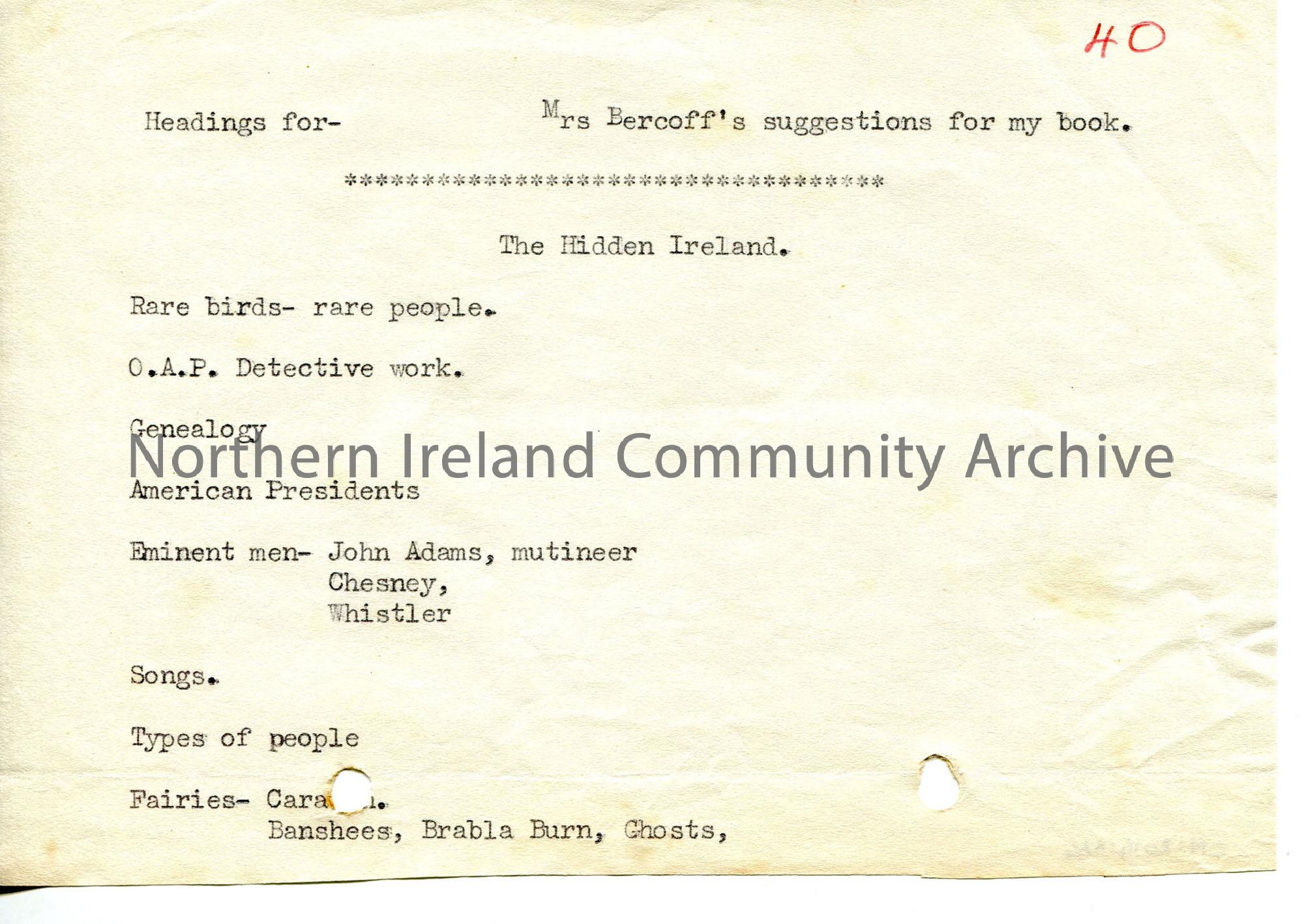 Typed brief notes – suggestions by a Mrs Bercoff for headings in a book ‘The Hidden Ireland’ about eminent men, songs, people, fairy stories, USA link…