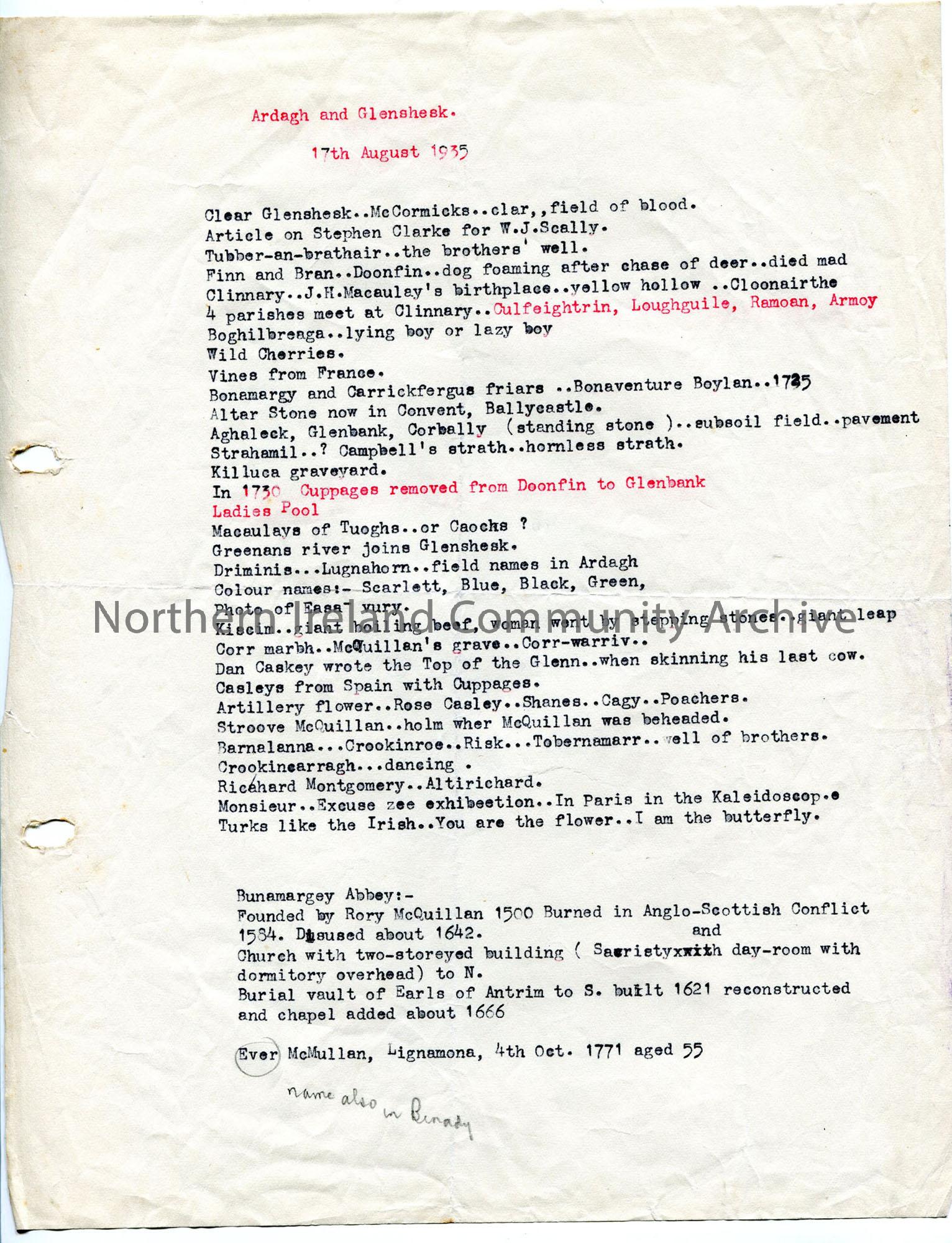 Typed brief notes under heading ‘Ardagh and Glenshesk’, with some details about Bonamargy friary