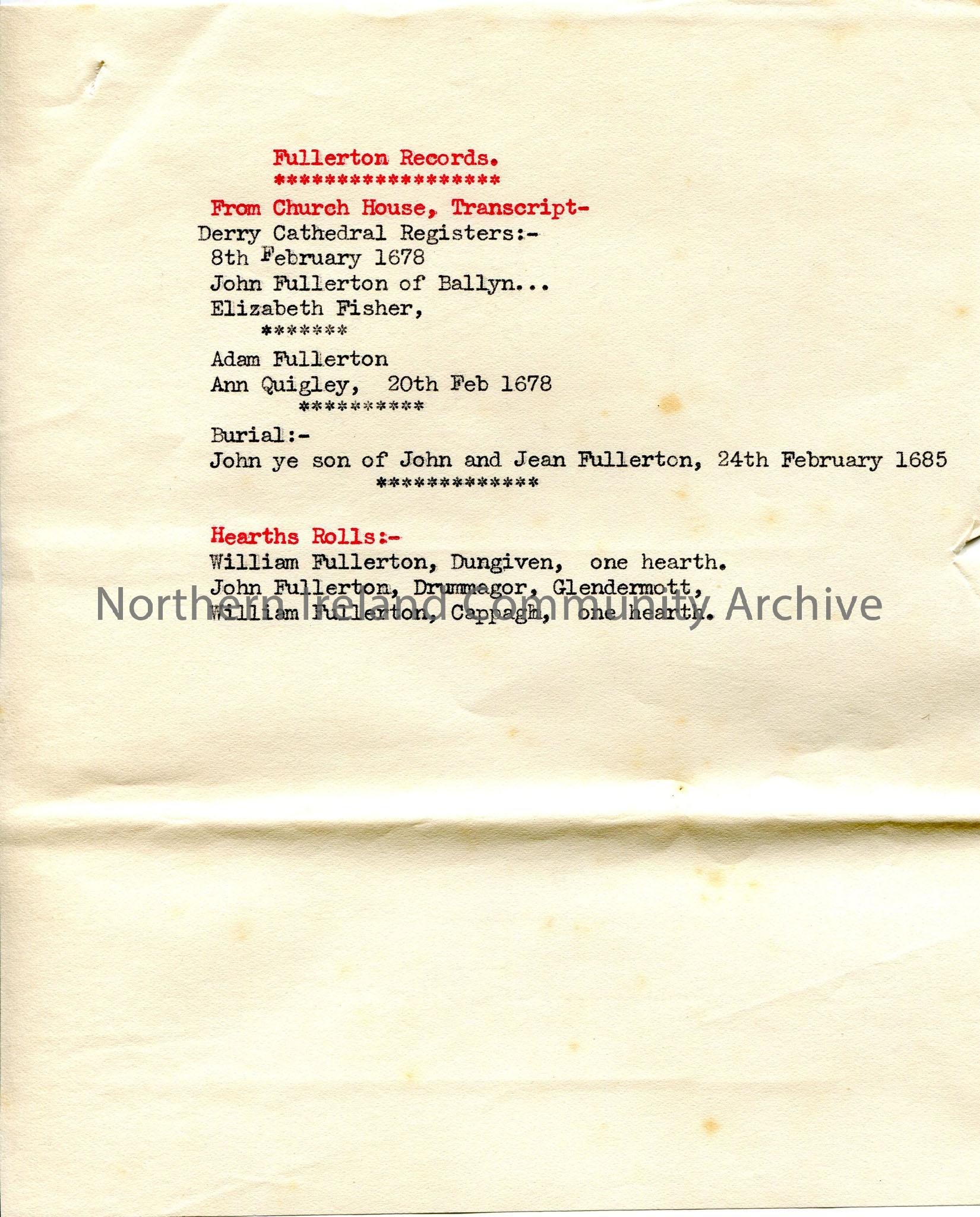 Typed brief notes under heading ‘Fullerton Records’ – 17th century entries from Derry Cathedral register and Hearth rolls