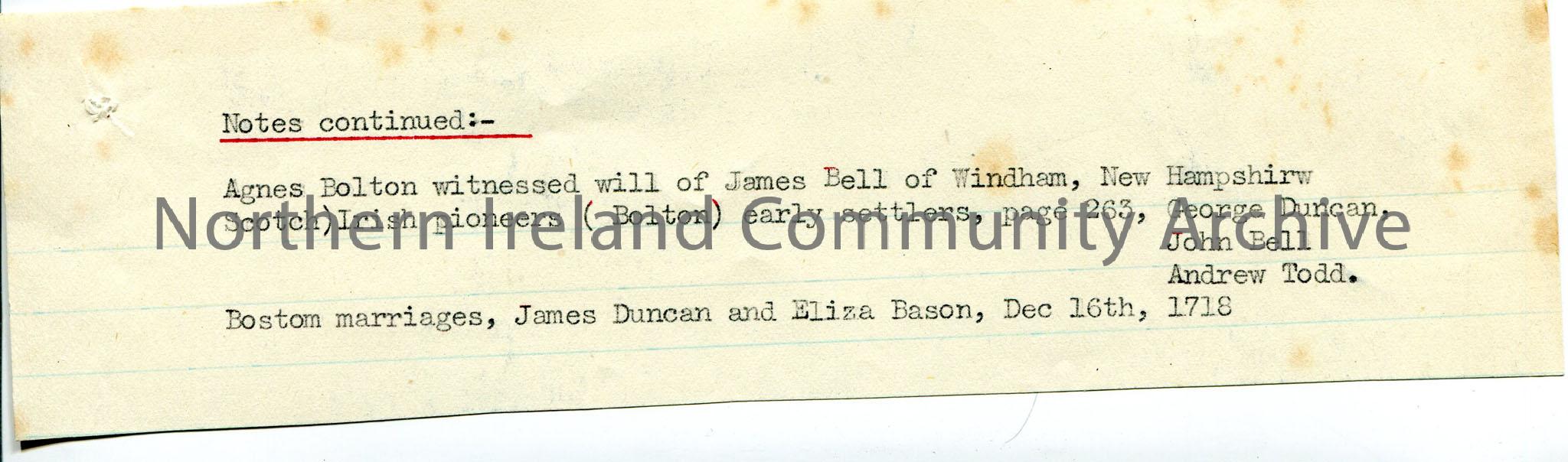 Typed brief notes under heading ‘Notes continued’ re Bells, Duncans, Todds