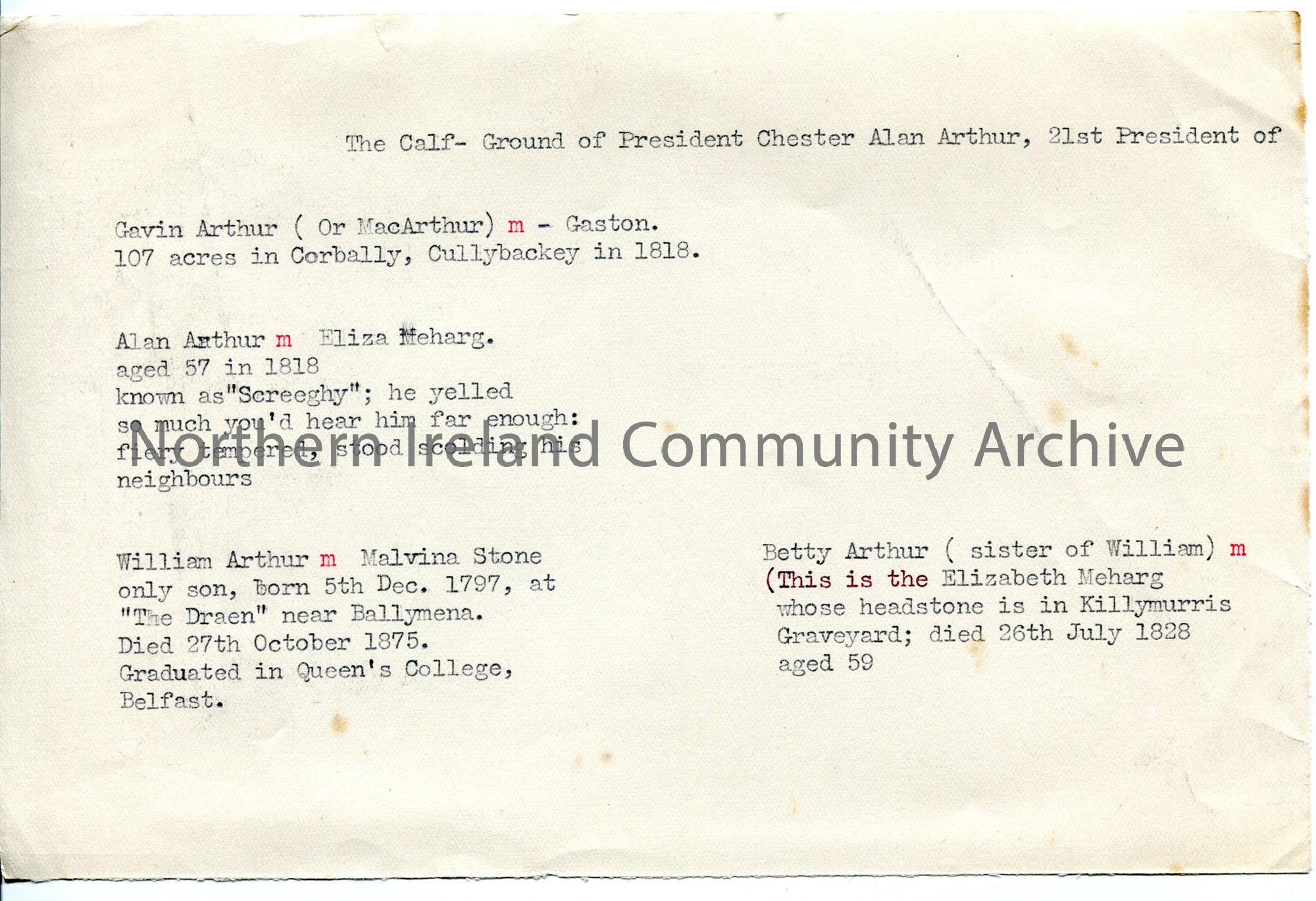 Typed brief notes under heading ‘The Calf-Ground of President Chester Alan Arthur, 21st President of ‘. Appears incomplete. Short details of several m…