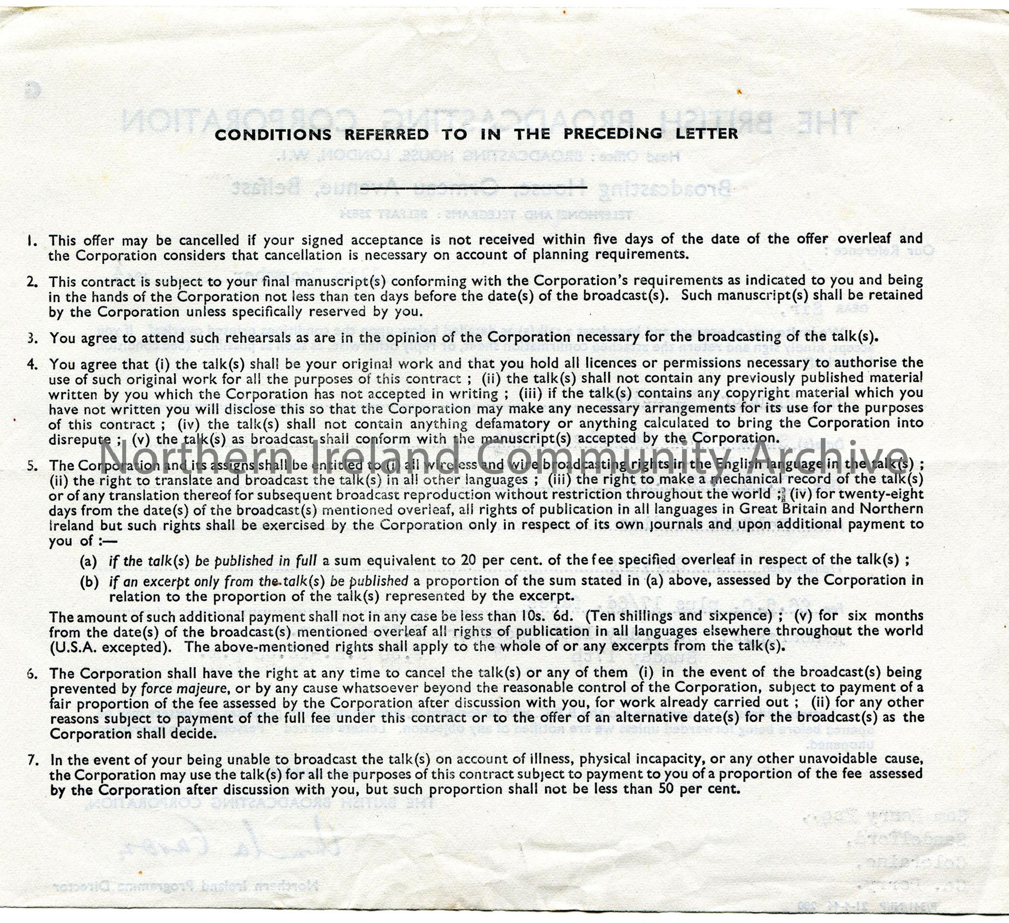 Typed contract from BBC, dated 11th December, 1944. from Ursula Eason, Northern Ireland Programme Director. Invites Sam to prepare and broadcast a talk "Country Magazine" Sunday 11th December, 1944, 1.15-1.45pm, Belfast Studios, Home Service transmission, £6.6.0 plus 17/6d. fares. Conditions on reverse.