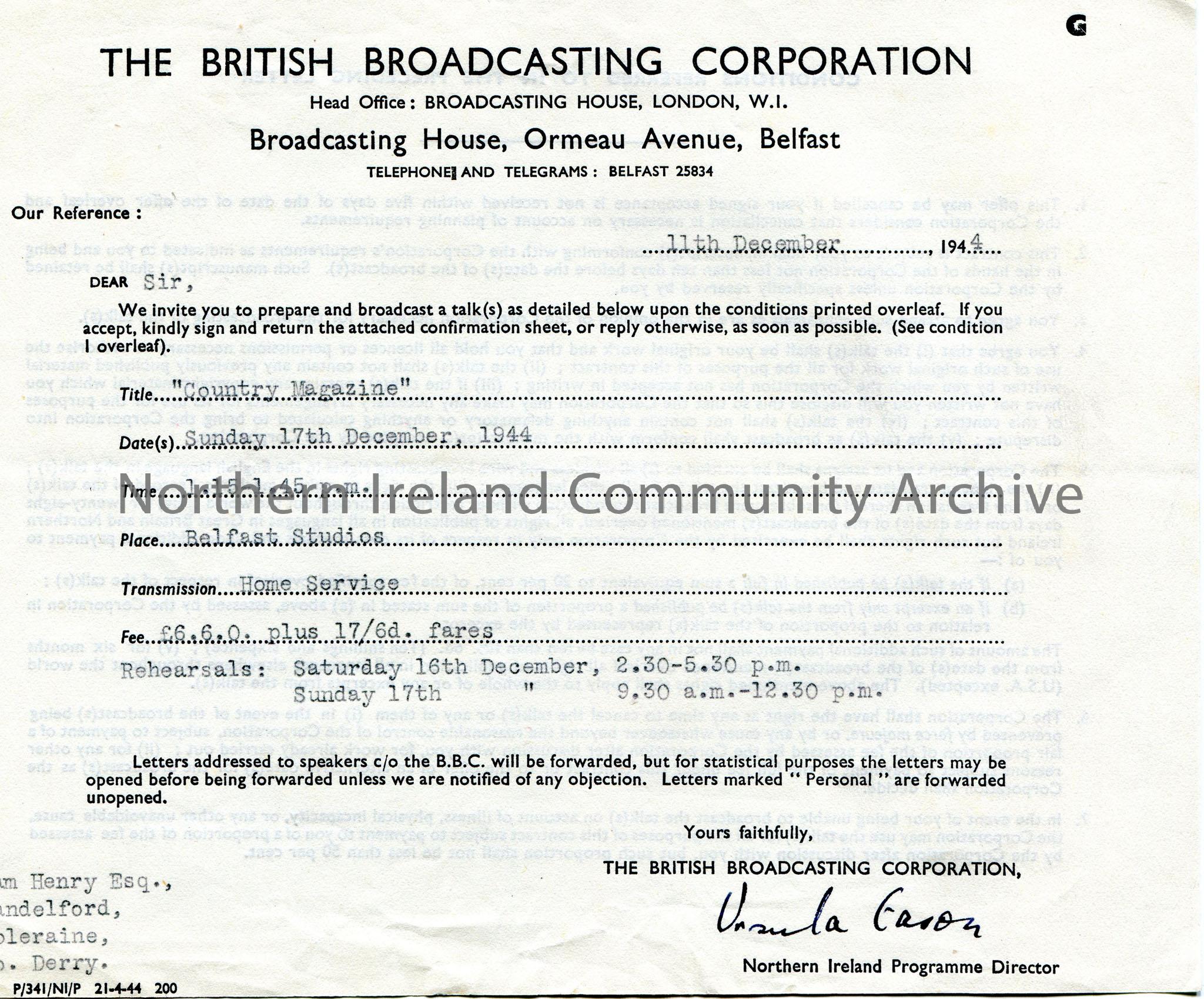 Typed contract from BBC, dated 11th December, 1944. from Ursula Eason, Northern Ireland Programme Director. Invites Sam to prepare and broadcast a talk "Country Magazine" Sunday 11th December, 1944, 1.15-1.45pm, Belfast Studios, Home Service transmission, £6.6.0 plus 17/6d. fares. Conditions on reverse.