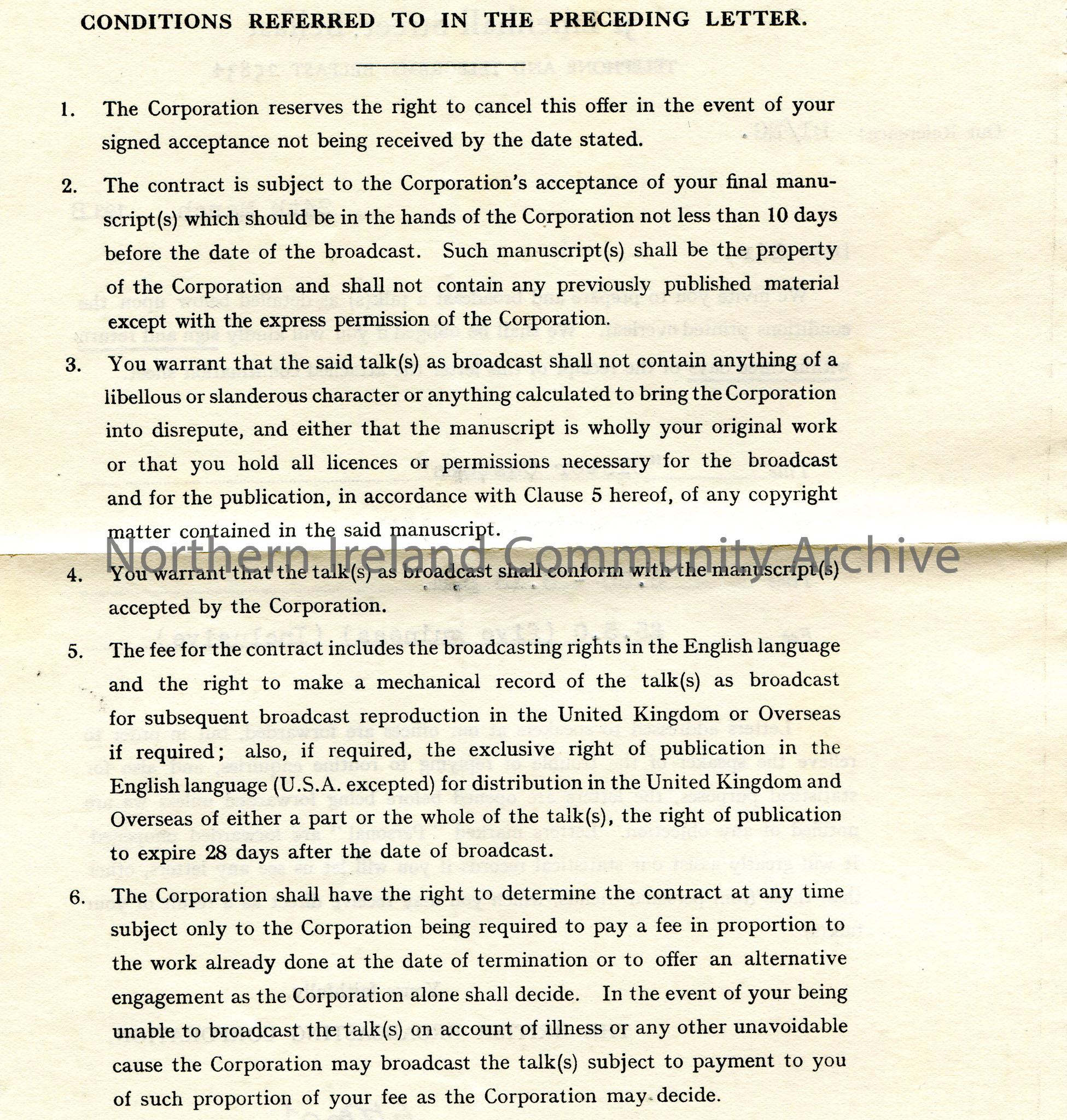 Typed contract from the BBC. Dated 24th March, 1938. An invitation to prepare and broadcast a talk, "Ulster Customs" on Wednesday 11th May. Includes timings and costs. Sam to sign and return confirmation sheet (not attached). Conditions on reverse of letter.