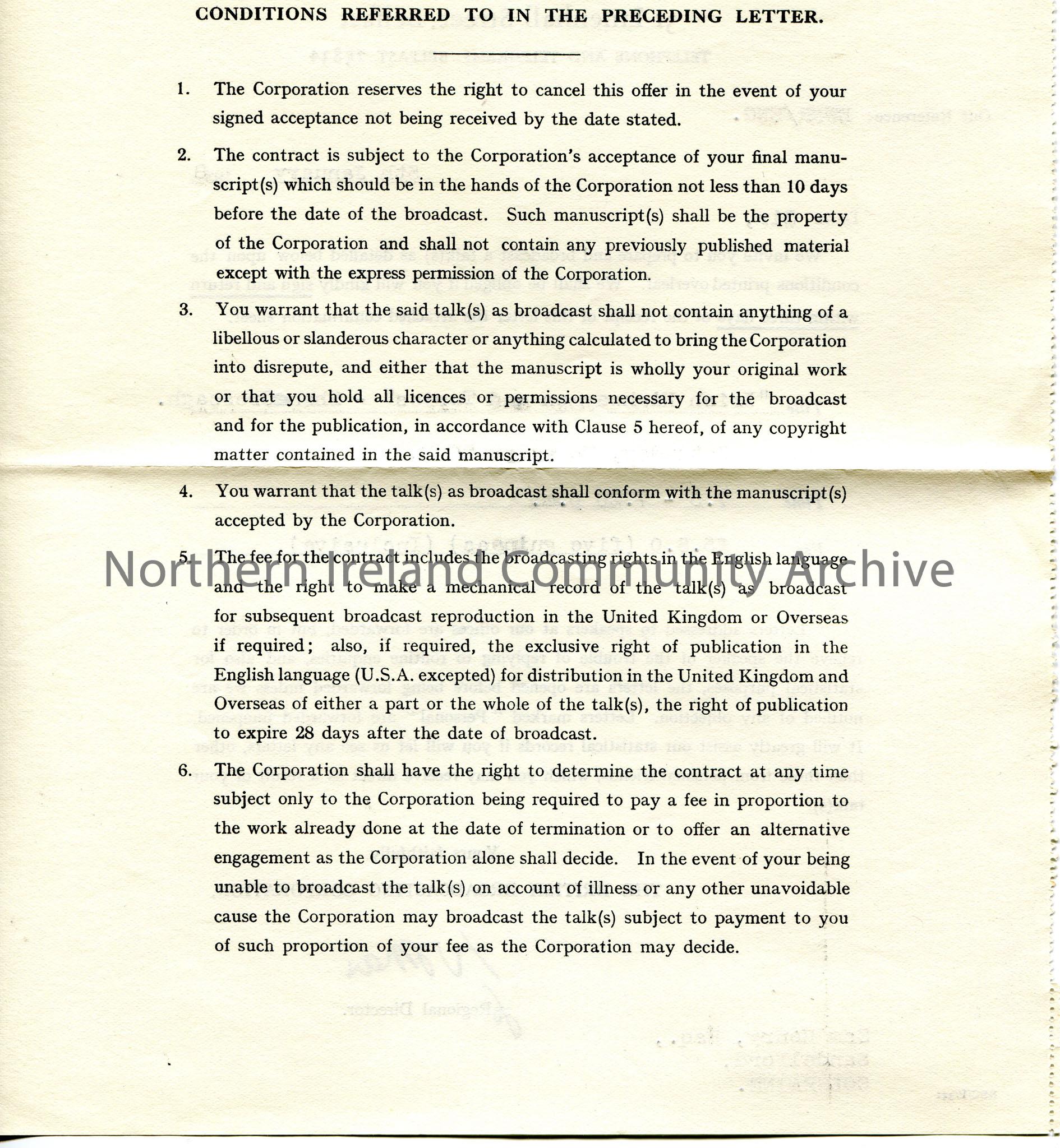 Typed contract to Sam Henry, addressed to Sandelford, Coleraine, on headed paper. Dated 5th January, 1938. Invitation for Sam to prepare and broadcast a talk titled, 'Irish Highwaymen and Tories - Shane Crossagh', on Saturday, 26th February as 7.5-7.20pm, for £5.5.0. Conditions of the talk on the reverse.