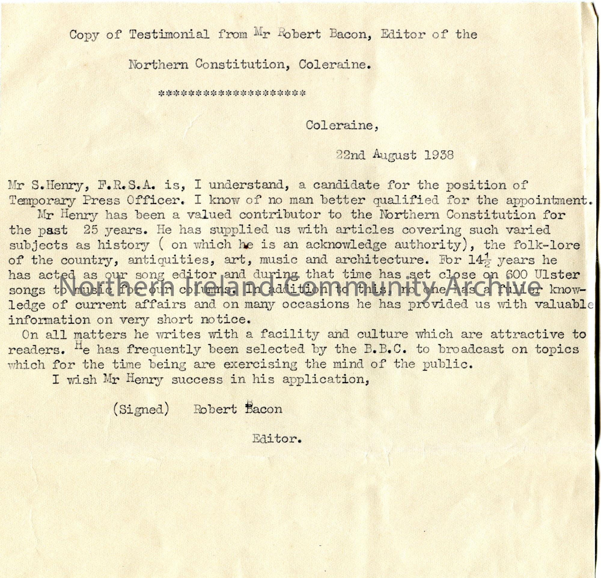 Typed copy, by Sam Henry, of a testimonial in the form of a letter. Recipient not specified. Speaks highly of Sam's work at the Northern Constitution for the past 14 1/2 years. Writes of his working achievements.