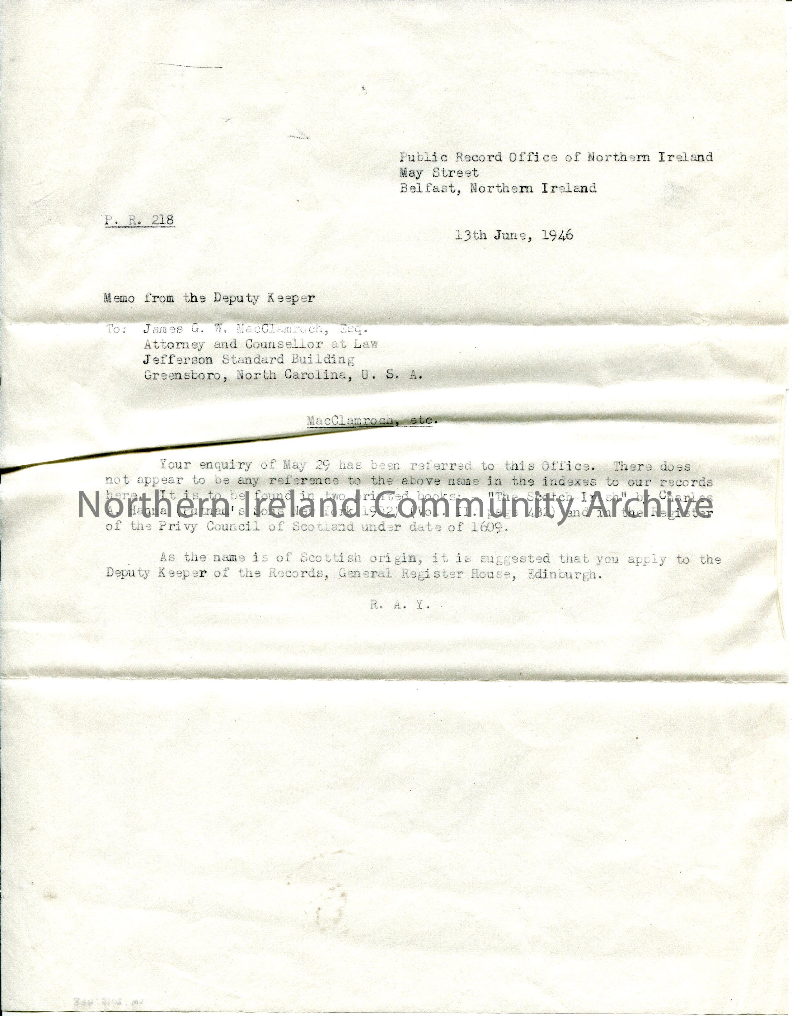 Typed copy of a letter to James G W MacClamroch, Attorney and Counsellor at Law. Responding to a genealogy query re the name MacClamroch. They have found a reference in book "The Scotch-Irish" by Charles A Hanna, 1902 and in Register of Privy Council of Scotland, 1609. Recommends contacting Deputy Keeper of Records, Edinburgh.