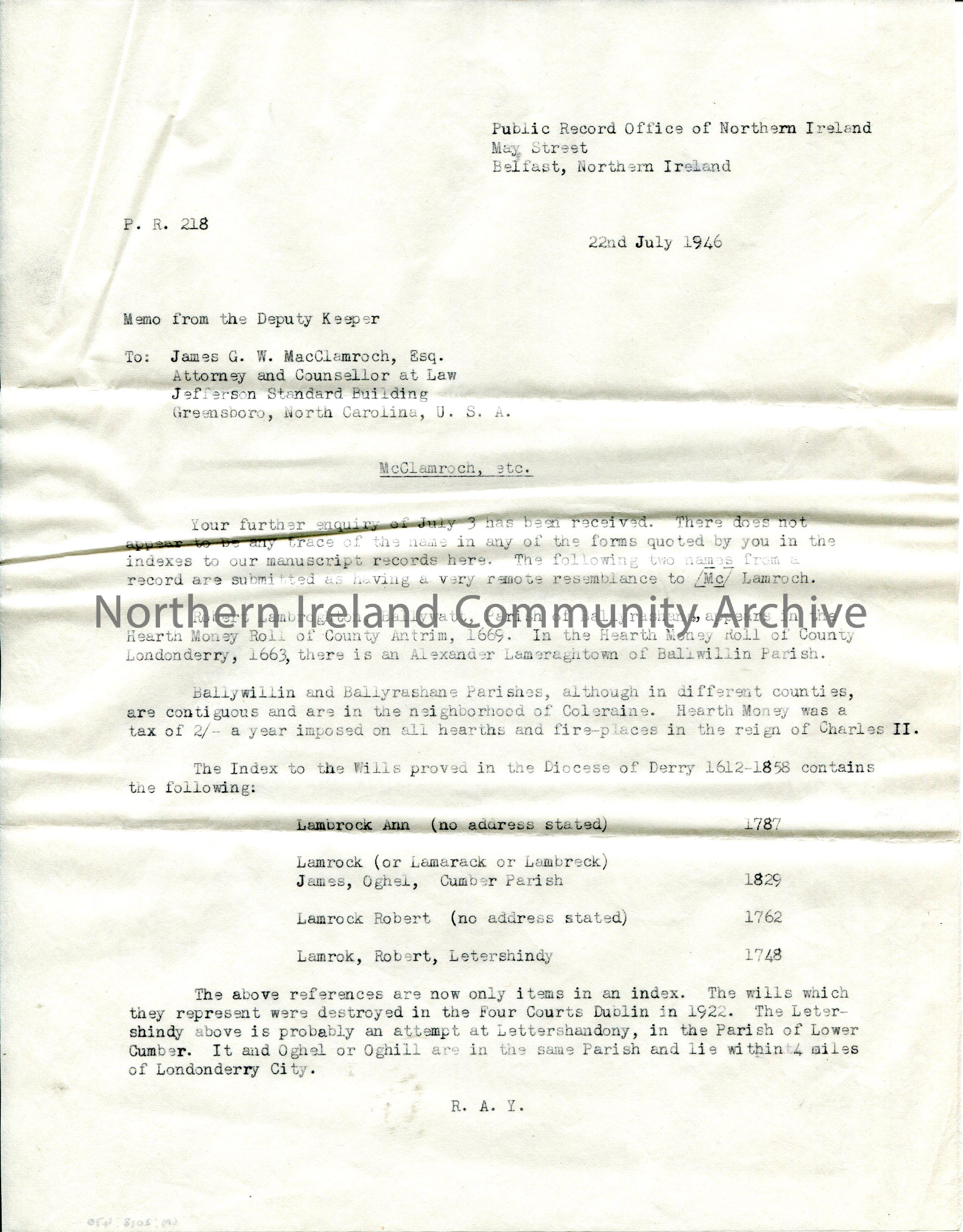 Typed copy of a letter to James G W MacClamroch, Attorney and Counselor at Law, USA. Re genealogical research of the name McClamroch and other variants of the name. Gives details of names found in Hearth Money Rolls of County Antrim, 1669 and County Londonderry, 1663 and Index to the Wills in the Diocese of Derry 1612-1858 re name Lambrock, Lamrock and Lamrok.