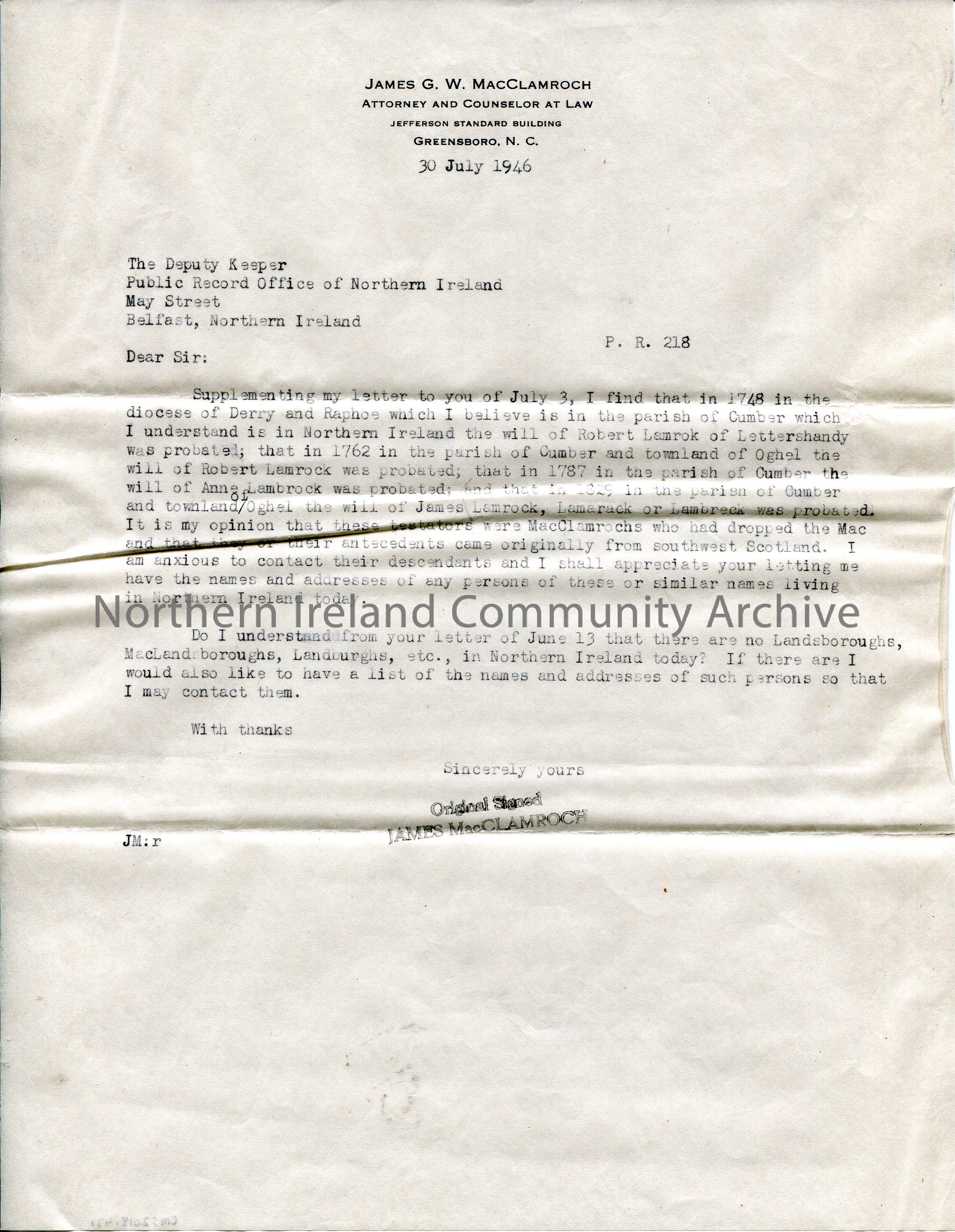 Typed copy of a letter to Public Record Office of Northern Ireland. Re genealogical research of the name McClamroch and other variants of the name. Re persons of the name Lamrock in the parish of Comber c18th century. Believes them to be ancestors who came from Scotland and wants to get in touch with descendants.