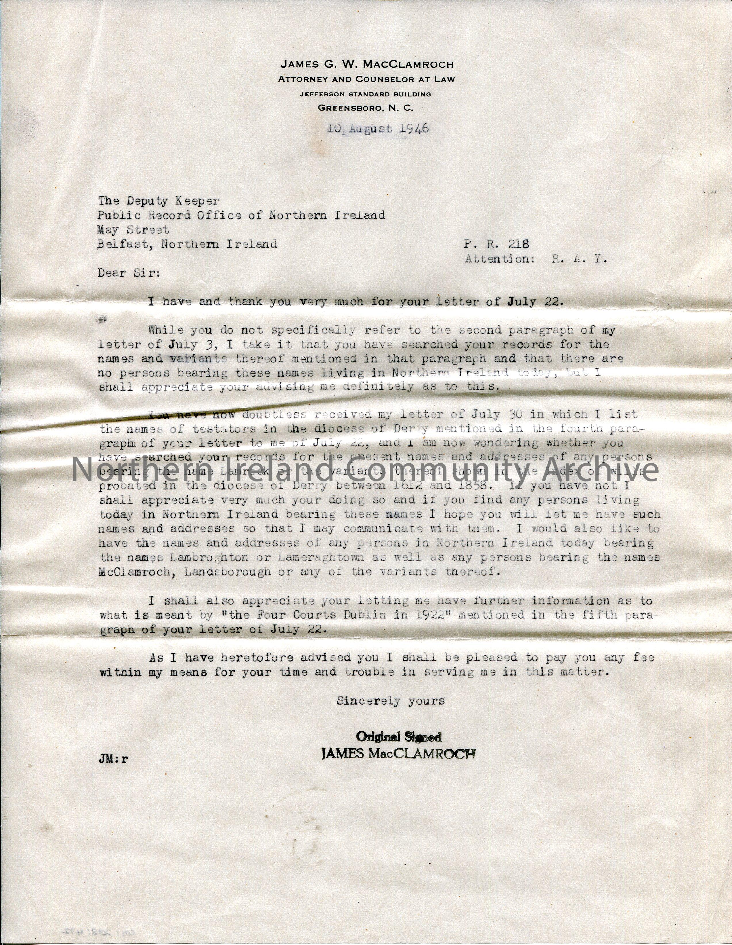 Typed copy of a letter to Public Record Office of Northern Ireland. Re genealogical research of the name McClamroch and other variants of the name.