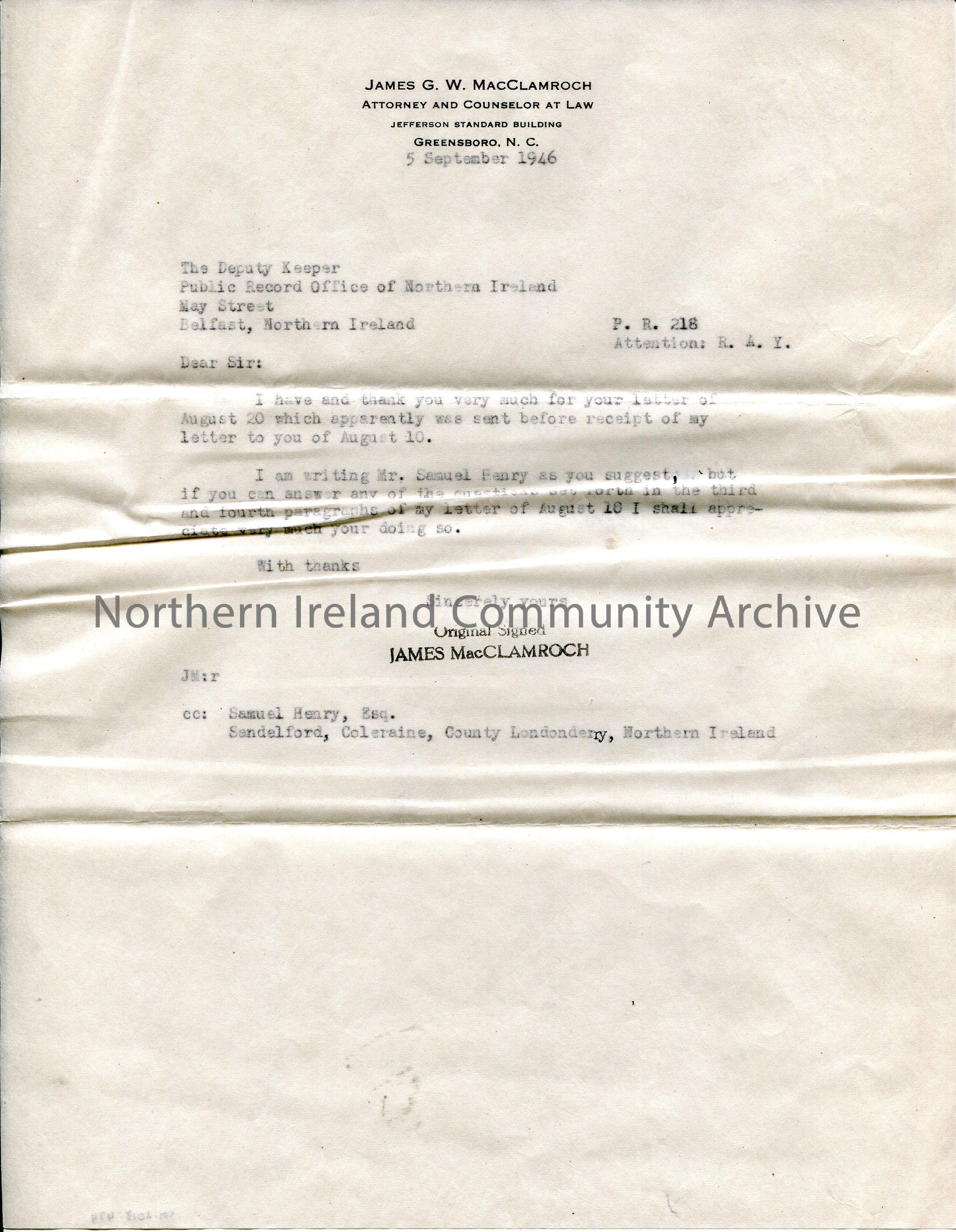 Typed copy of a letter to Public Record Office of Northern Ireland. Re results of genealogical research of their family name McClamroch. He has contacted Sam Henry to help with the research.