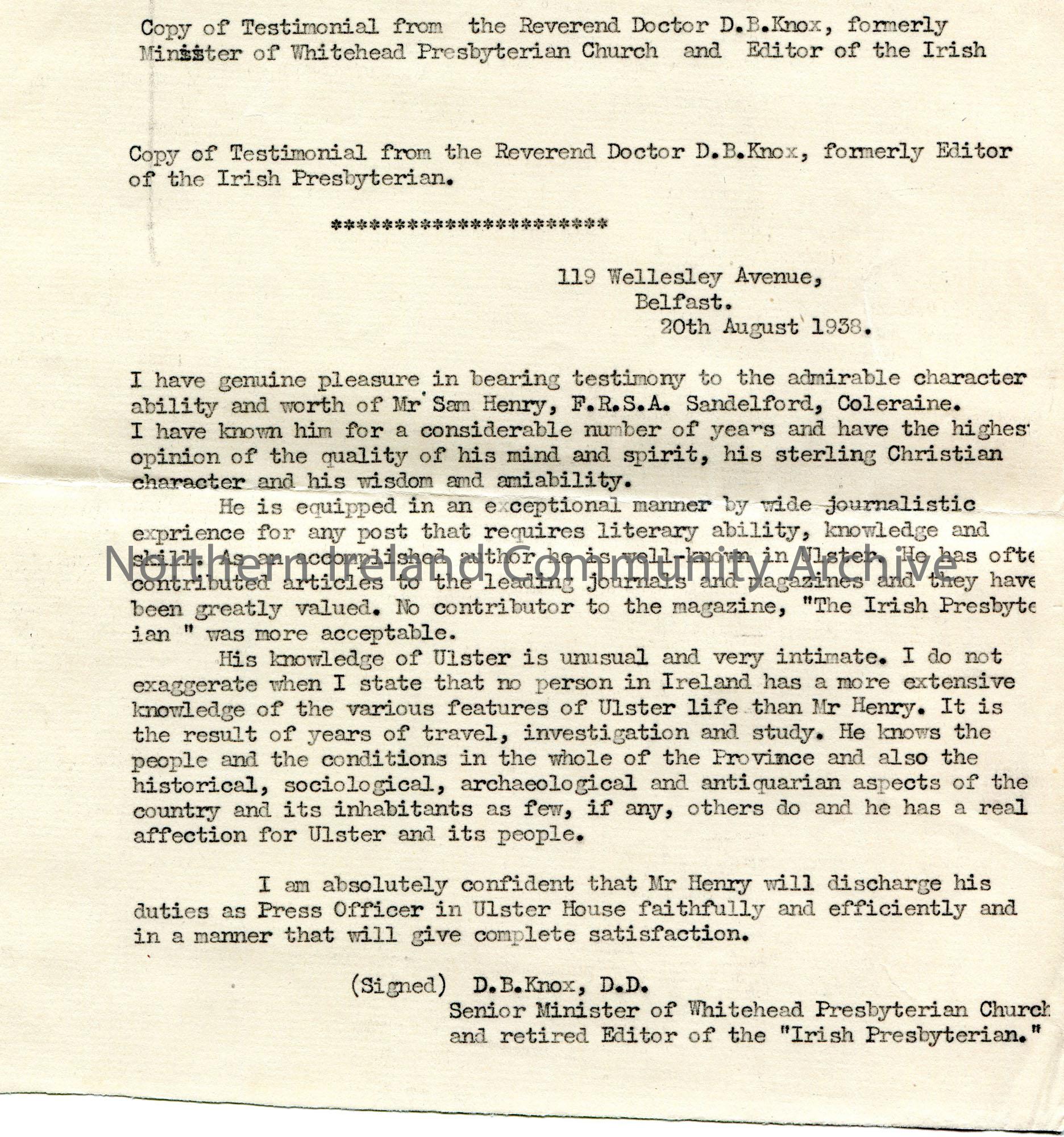 Typed copy of a transcription by Sam Henry of a handwritten testimonial for Sam Henry re his application for post of Temporary Press Officer at the New Ulster House. Speaks highly of his character and official duties.