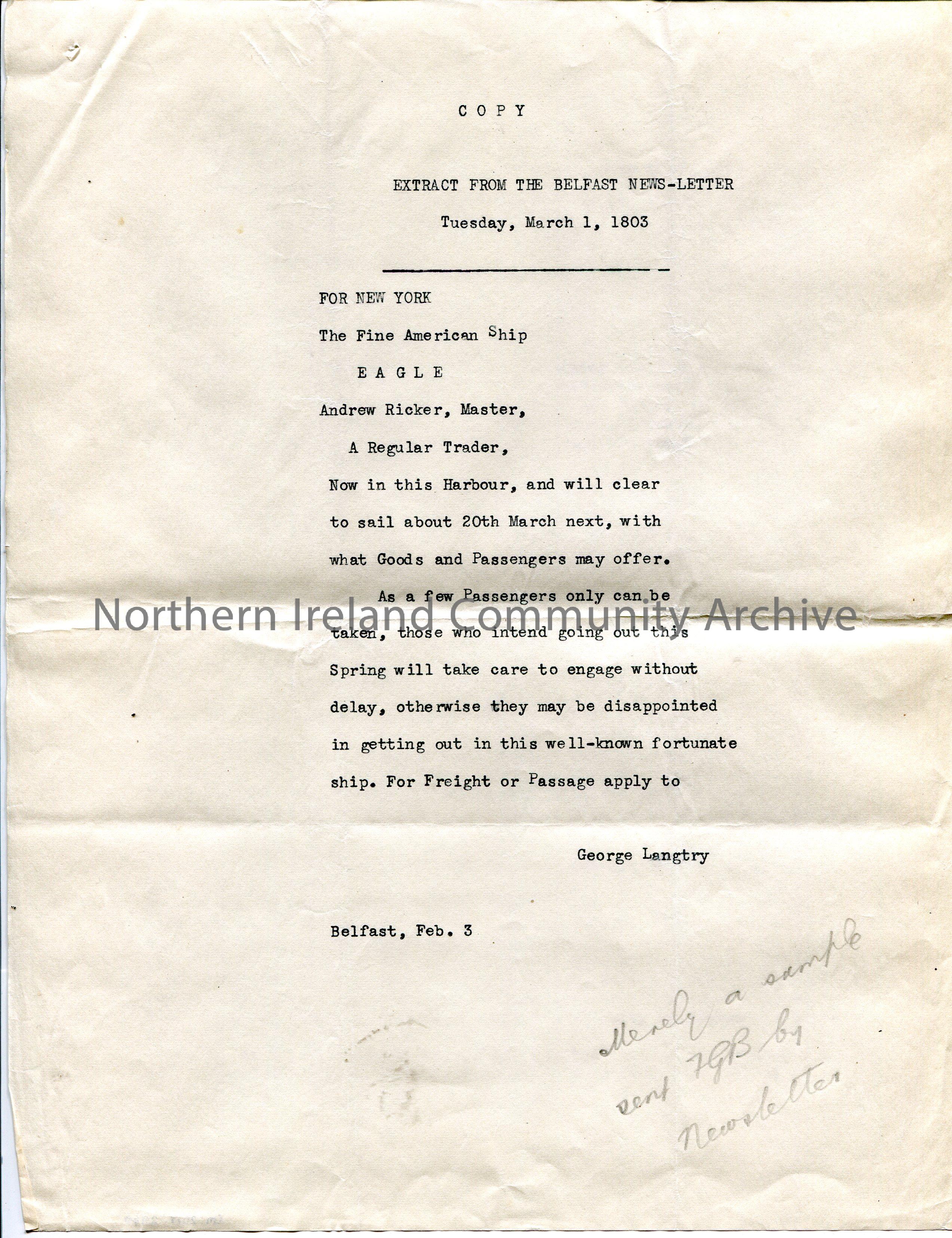 Typed copy of an extract from the 'Belfast News-Letter'. Dated Tuesday 1st March, 1803. Re the impending sailing of the American ship 'Eagle' to New York. Calling for anyone wishing to sail or transport freight to contact George Langtry. 'Merely a sample sent FGB by Newsletter' handwritten in pencil at bottom of page.