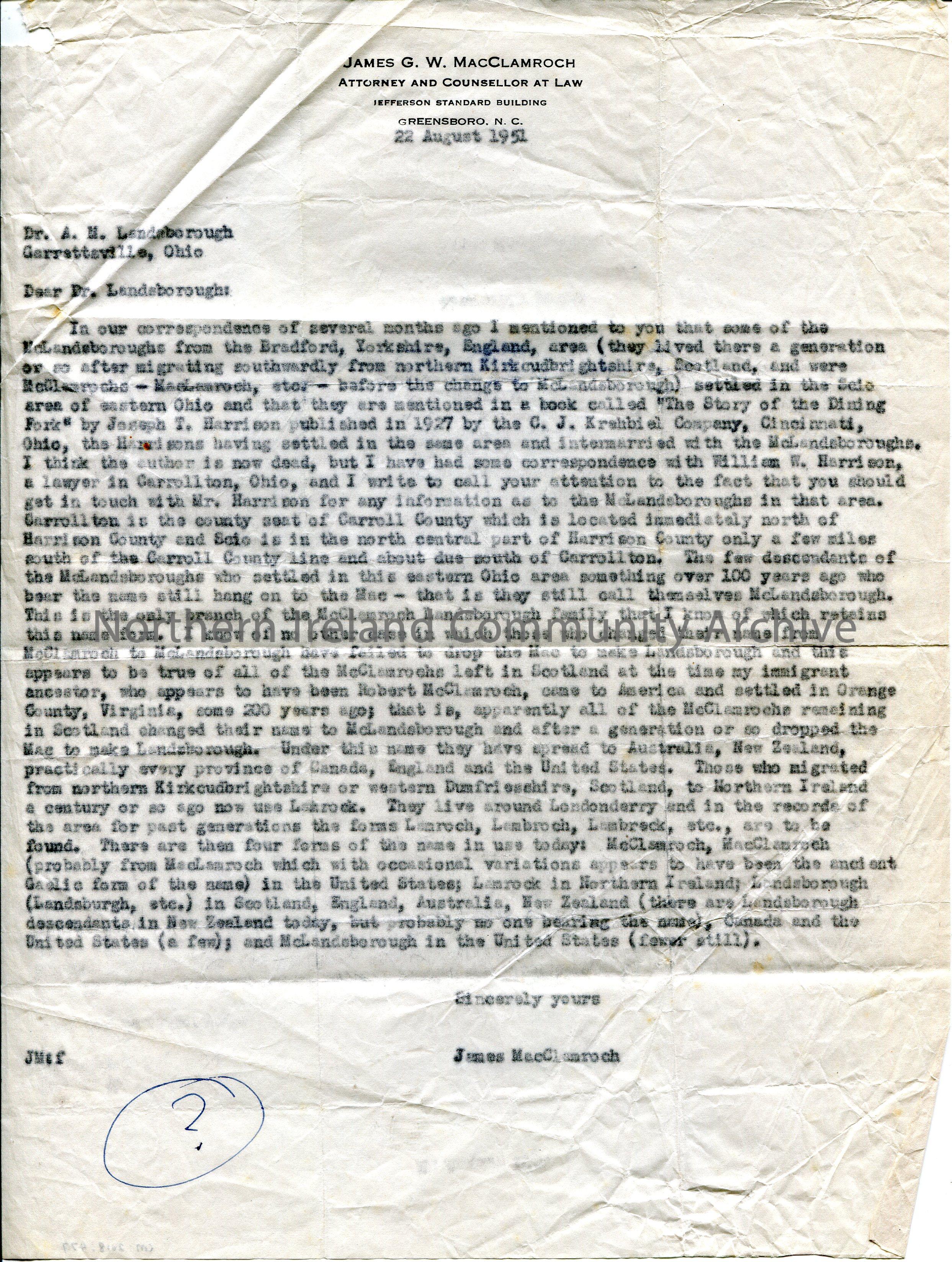 Typed copy of letter to Dr A M Landaborough, Garrettaville, Ohio. Providing information on their genealogical research to trace their own ancestors and descendants of surname MacClamroch and variants of it.
