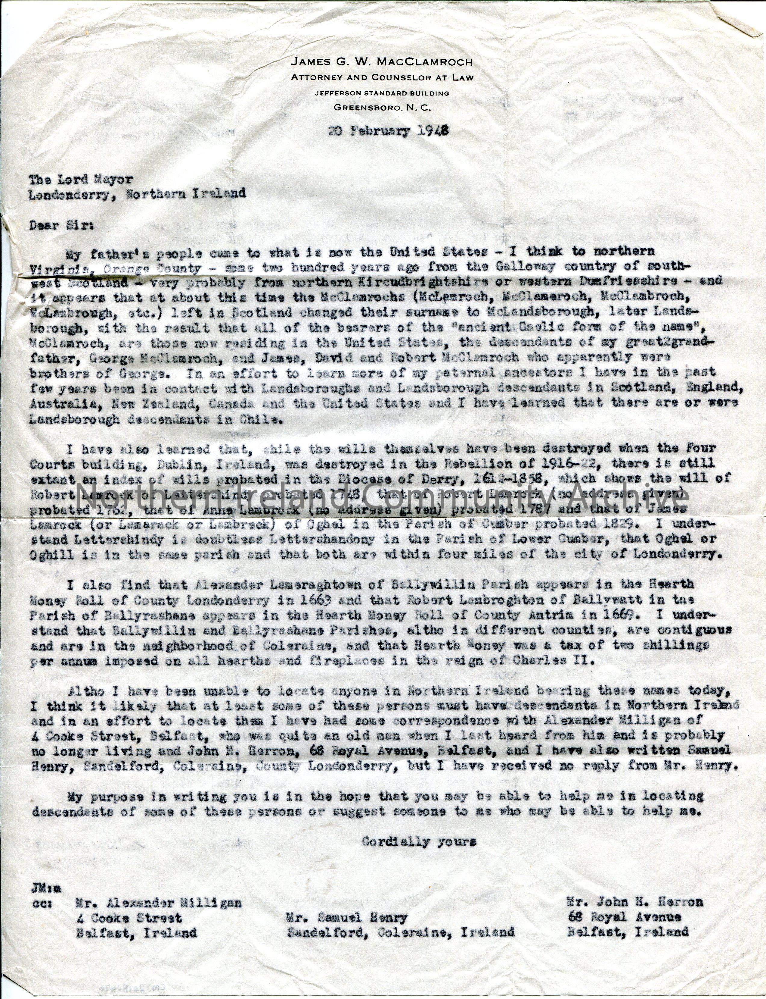 Typed copy of letter to The Lord Mayor, Londonderry, Northern Ireland. Alexander Milligan, Samuel Henry and John Herron are copied into the letter. Details their progress to date in their genealogical research to trace their own ancestors and decendants of surname MacClamroch and variants of it in Northern Ireland. Notes that Sam Henry has not replied to letters sent to him re this matter.
