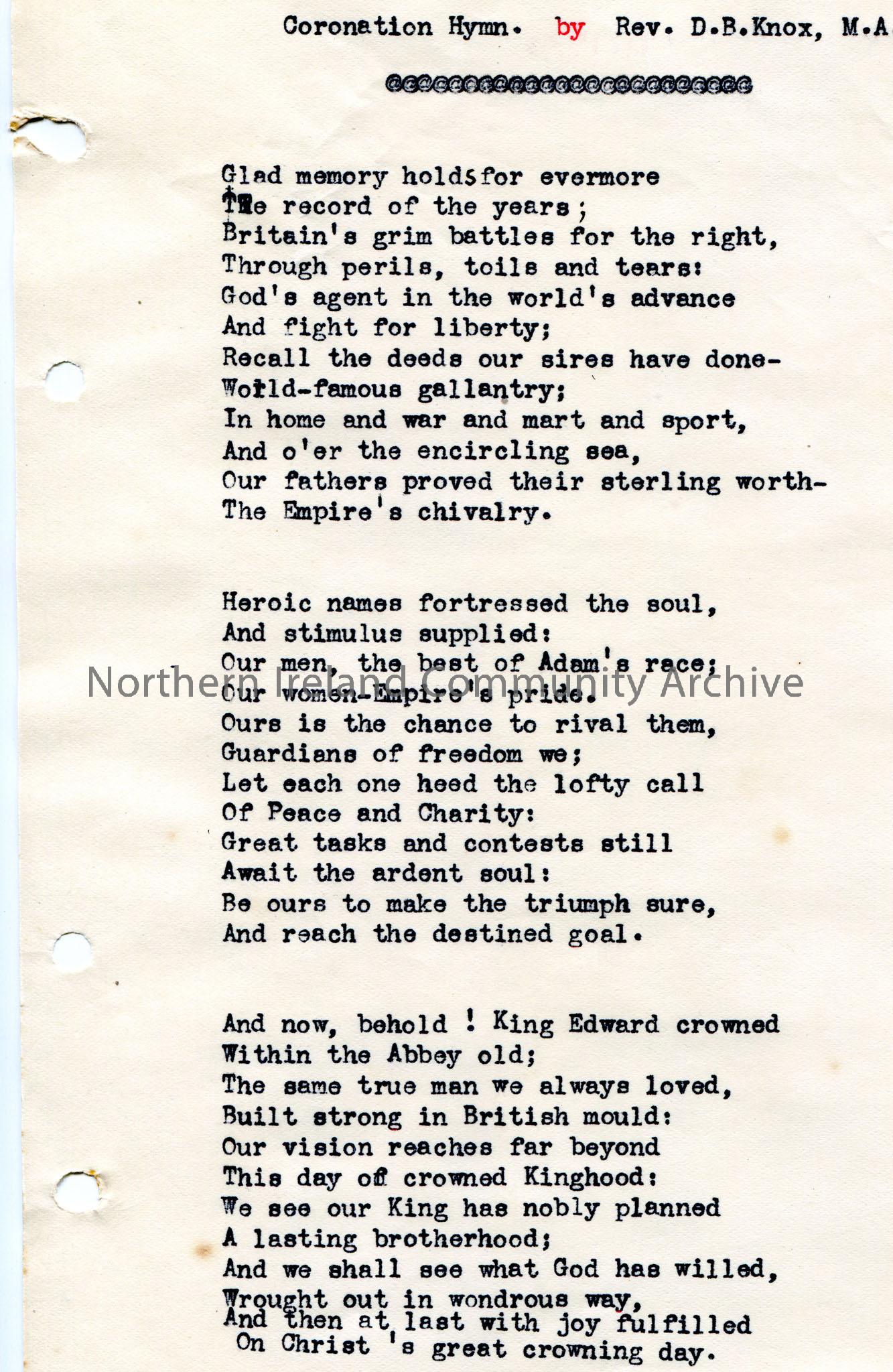 Typed ‘Coronation Hymn’ by Rev. D.B.Knox, M.A. 3 verses. Mentions King Edward.