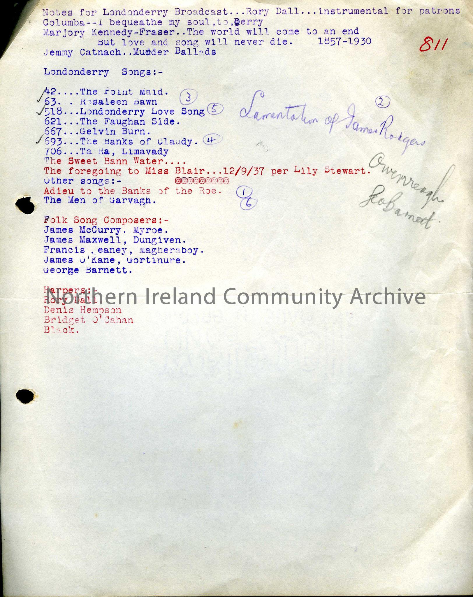 Typed document containing notes for Londonderry Broadcast including a list of Londonderry songs, composers and harpers.