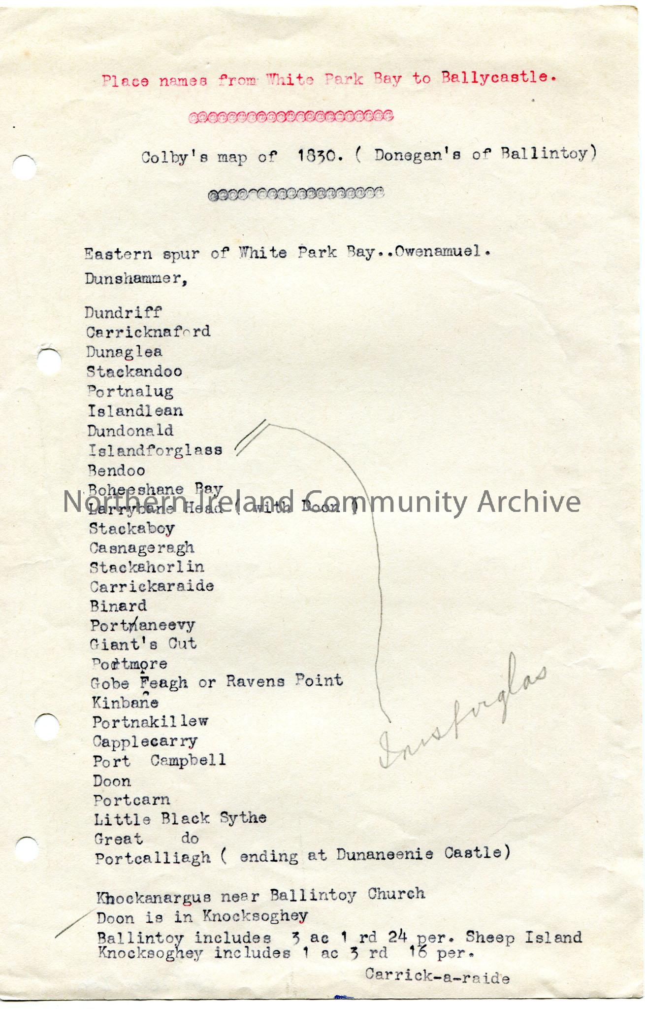 Typed document of ‘Place names from White Park Bay to Ballycastle. Colby’s map of 1830. (Donegan’s of Ballintoy)’.